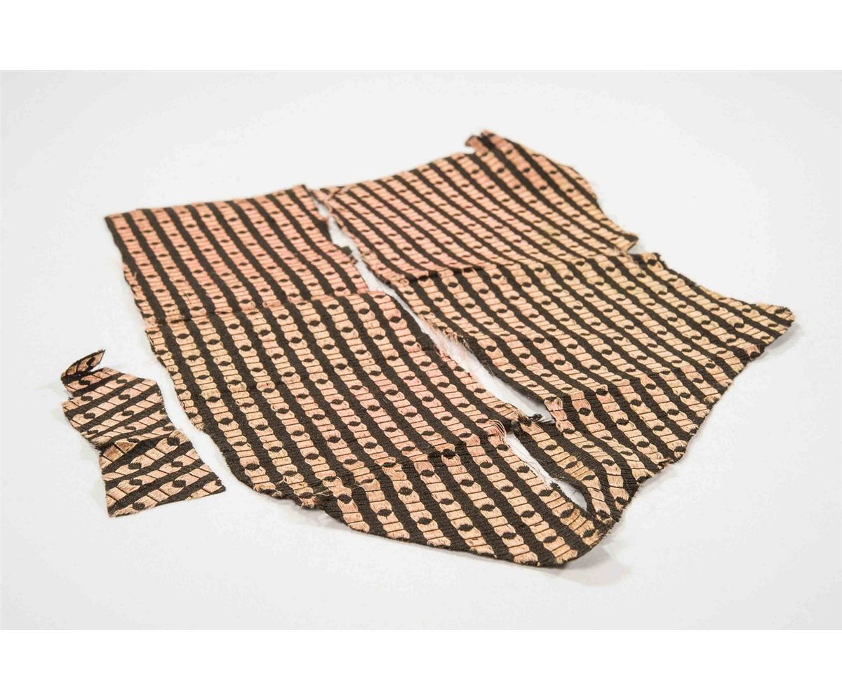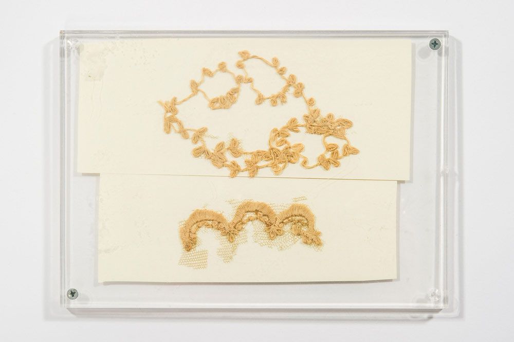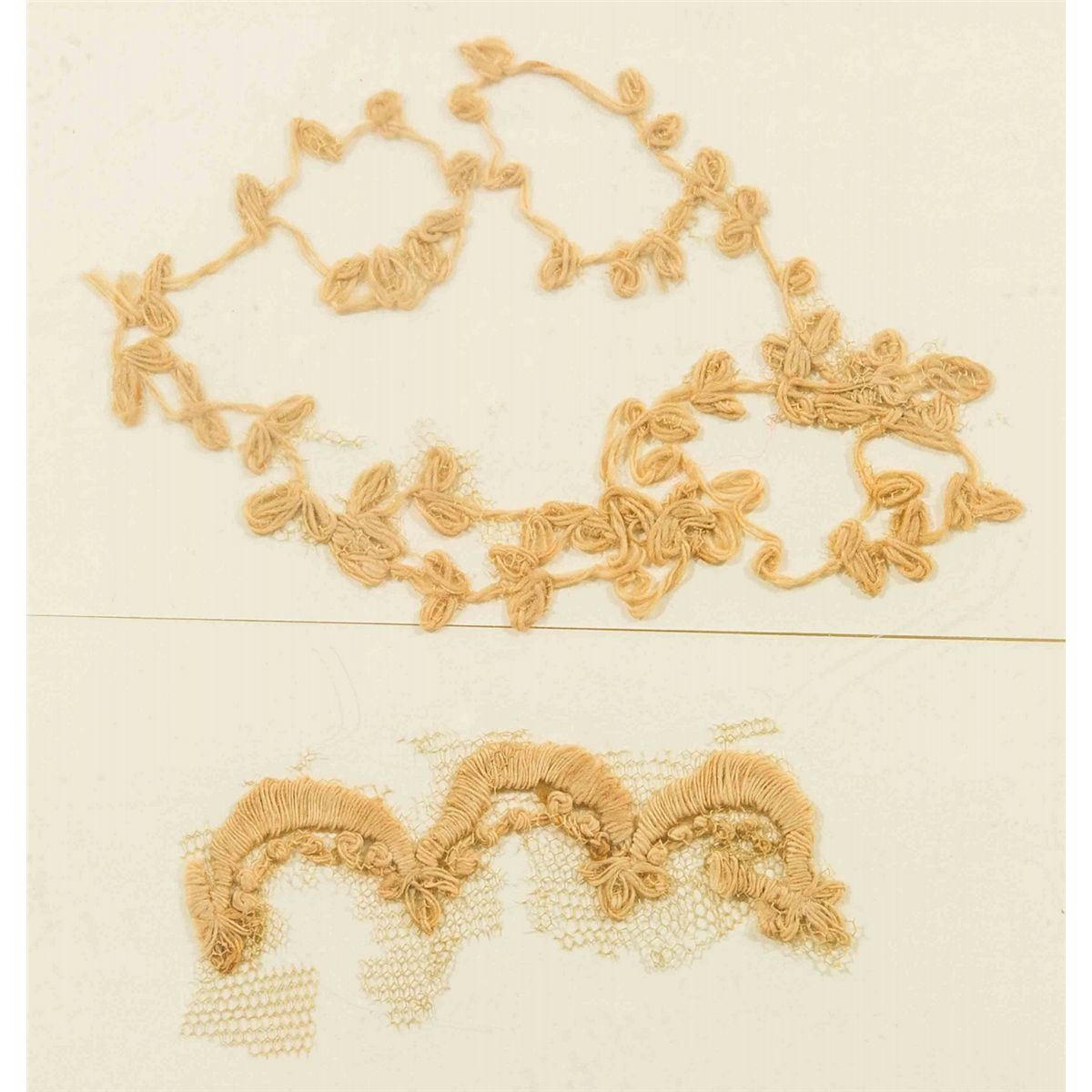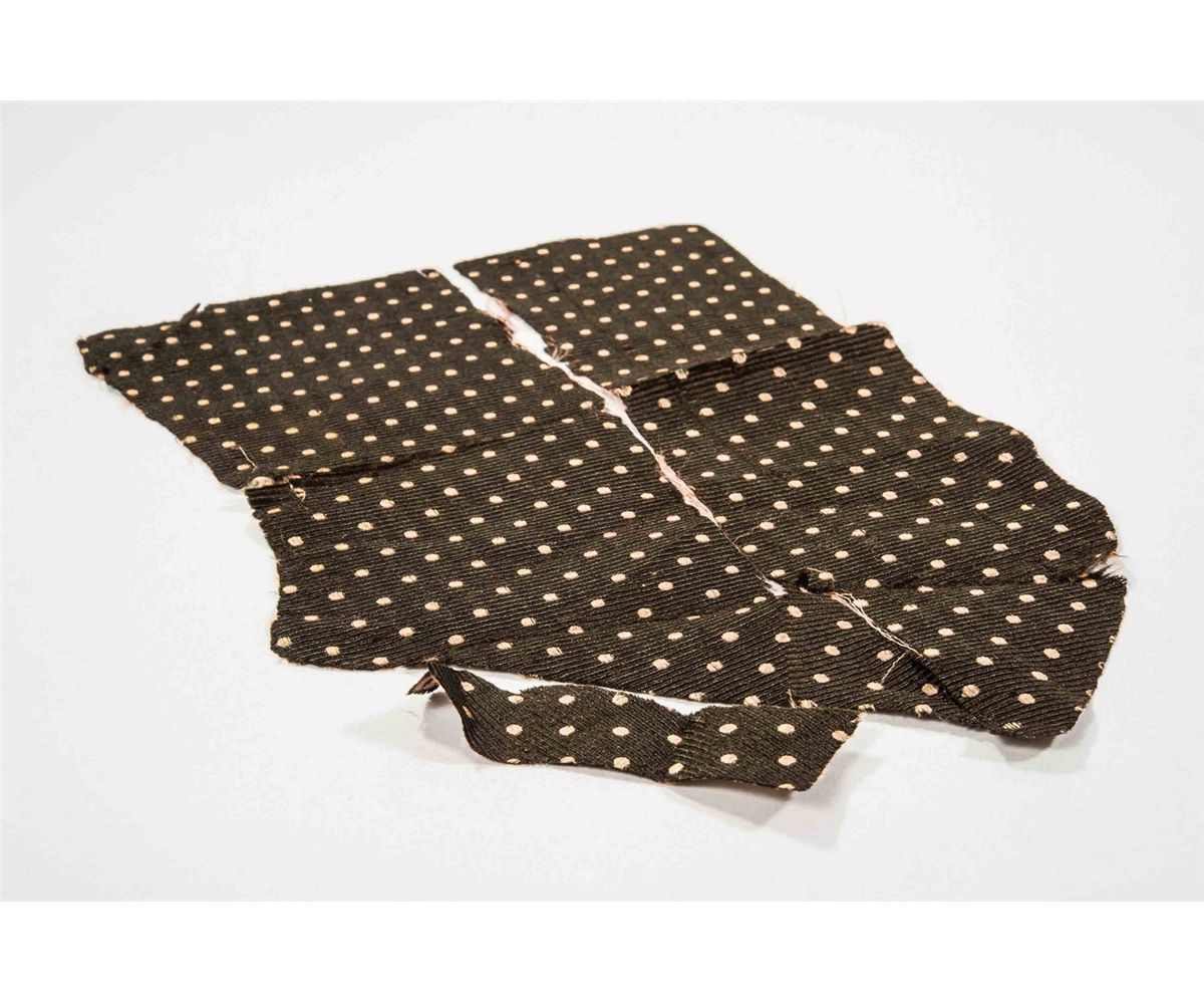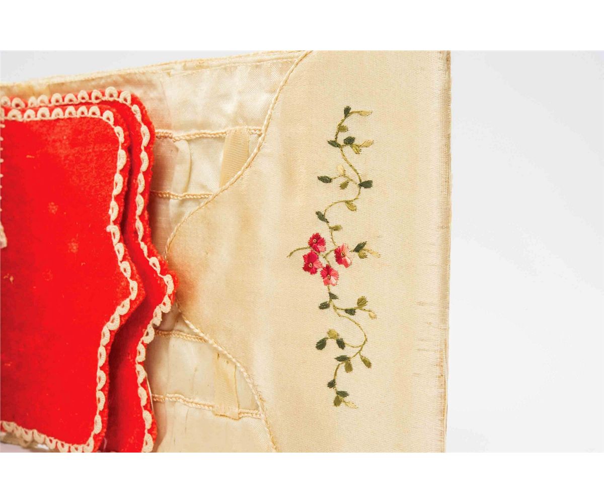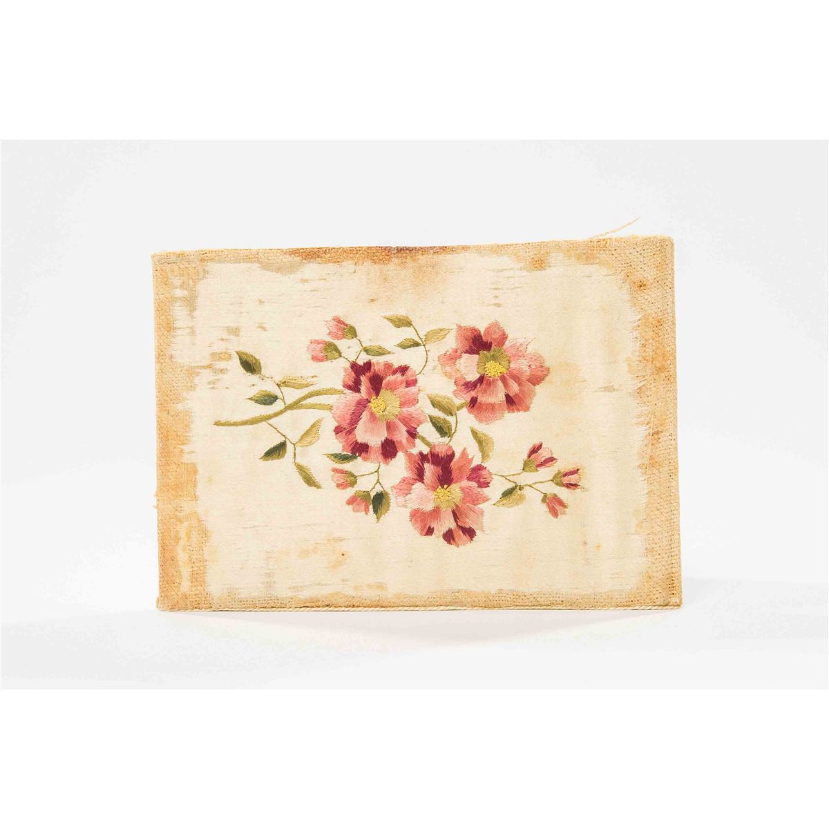 Remarkable collection consisting of Abigail Adams’s personally-owned and -used sewing needle case and two swatches of the dress Adams is seen wearing in her famous portrait by Gilbert Stuart. Her sewing kit needle case, sewn by Abigail Adams herself, is an off-white silk with beautifully embroidered floral designs on both sides, opening to reveal slots for her sewing materials and implements, with two inner pocket flaps nicely embroidered with flower and bird designs. Also included are two generous dress fabric swatches, each measuring 3 x 8, and two different strands of delicate lace trim identifiable in the Gilbert Stuart portrait of the first lady now held by the National Gallery of Art. Includes a July 1876 handwritten letter of provenance from First Lady Abigail Adams’s own granddaughter, Elizabeth Coombs Adams, signed “E. C. A.,” in full: “A piece of Reps silk dress worn by Abigail Adams in London, wife of John Adams, Minister to the Court of St. James, Coming home to Quincy in 1787—& bought the home stead which has had five generations living in it. This dress & long train left to my mother in Abigail’s will. The Reps silk with the pink dots and garnet sattin dress that she is painted in Stuart’s portrait & now belongs to the Charles F. Adams’ & I have the old lace scarf back from the old State House in Philadelphia where we sent things for the Centennial.” The sewing kit is accompanied by a contemporary note in another hand, reading: “Needle case belonging to Abigail Adams.”