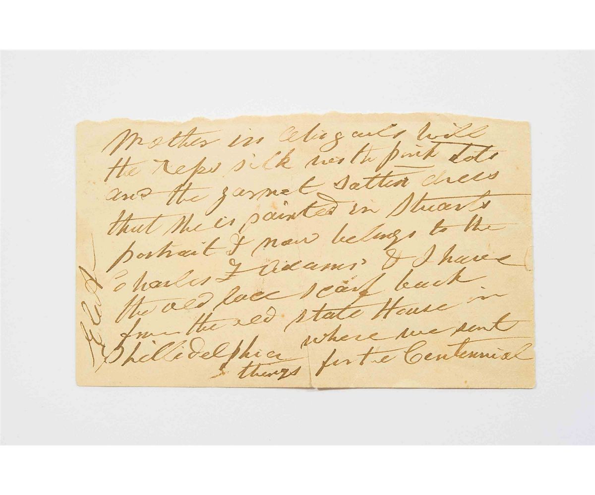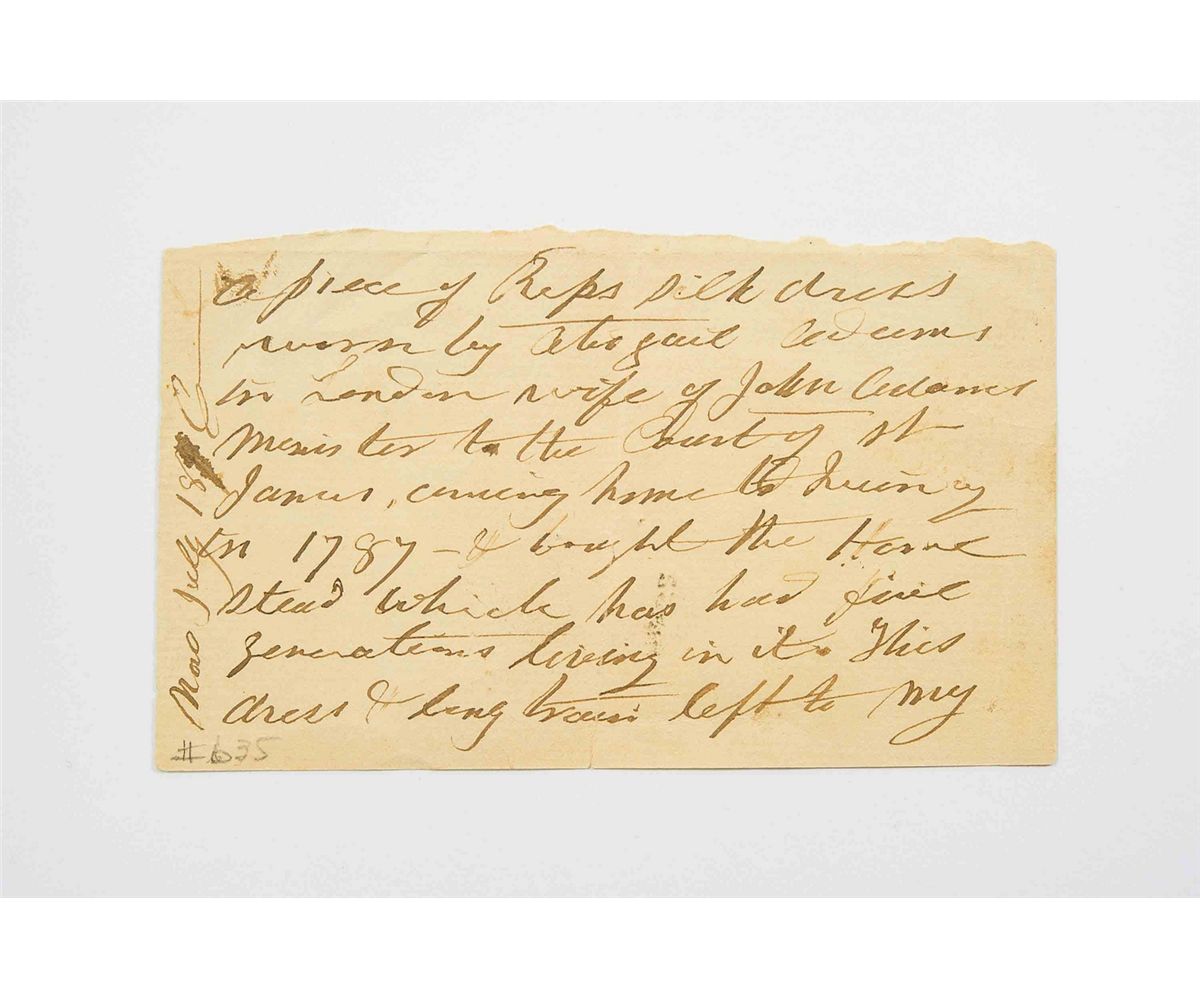 Material related to Abigail Adams is extremely rare—more so than Martha Washington—particularly with the superior provenance provided in the form of a 19th-century note by her granddaughter. Elizabeth Coombs Adams was related to President John Adams and First Lady Abigail Adams via her father, Thomas Boylston Adams, who was their son and the brother of John Quincy Adams. Like much of the family, Thomas Boylston struggled with alcoholism, and Elizabeth Coombs Adams moved to the family mansion in Quincy and lived there with her uncle and aunt, John Quincy and Louisa Adams, for a period of time. A marvelous grouping of important material from one of the nation’s preeminent 'Founding Mothers.' A truly epochal offering worthy of the most advanced collector or institution.