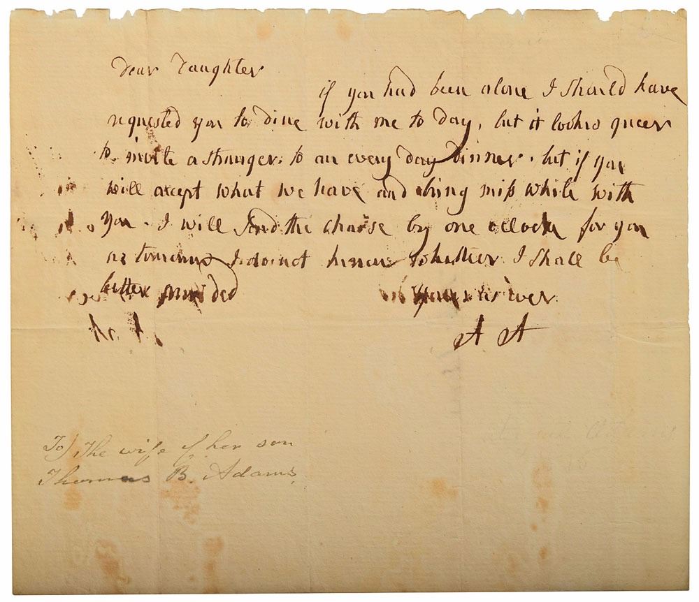Scarce ALS signed “A. A.,” one page, 7.25 x 5.75, no date. Letter to the wife of her son Thomas B. Adams, addressed, "Dear Daughter," in part: "If you had been alone I should have requested you to dine with me to day, but it looked queer to invite a stranger to an every day dinner. But if you will accept what we have and bring miss white with you, I will send the chaise by one o'clock for you." Also addressed on the reverse in her own hand, "Miss Adams." In fine condition, with scattered light staining.