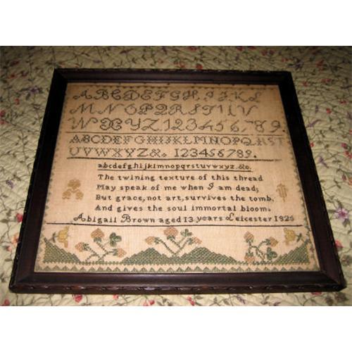 Abigail Brown Sampler done in 1825 at age 13 in Leicester, Massachusetts. Most likely stitched at the Leicester Academy. There is a similar sampler in the collection of Sturbridge Village done by Louisa Earle in 1815. <P>