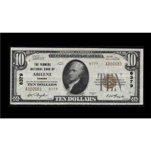 <B>Abilene, KS</B></I> - $10 1929 Ty. 2 <B>The Farmers NB</B></I> Ch. # 8379<BR>A fresh and crispy <B>Extremely Fine</B></I> with some claims to the AU grade. Notes as fresh and appealing as this nice example often sell for premiums above what their technical grade would imply.