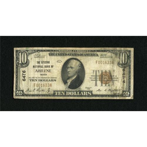 <B>Abilene, TX</B></I> - $10 1929 Ty. 1 <B>The Citizens NB</B></I> Ch. # 6476<BR> A few pulls and wallet staining are noticed on this <B>Very Good+</B></I> note. This is also a scarcer family run Abilene bank. Fine, with signatures of Geo. L. Paxton, Jr. and Geo. L. Paxton.<BR><BR><b>Shipping:</b> Coins & Currency (<a target="_blank" href="http://www.heritageauctions.com/common/shipping.php">view shipping information</a>)