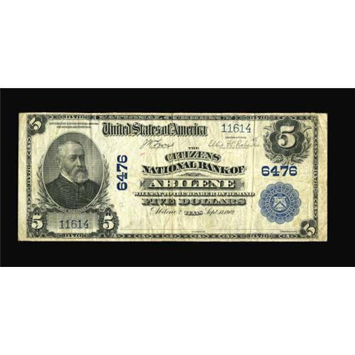 <B>Abilene, TX</B></I> - $5 1902 Plain Back Fr. 598 <B>The Citizens NB</B></I> Ch. # 6476<BR> A tougher Abilene note from this family owned bank, with only six large survivors documented. <B>Very Fine.</B></I><BR><BR><b>Shipping:</b> Coins & Currency (<a target="_blank" href="http://www.heritageauctions.com/common/shipping.php">view shipping information</a>)