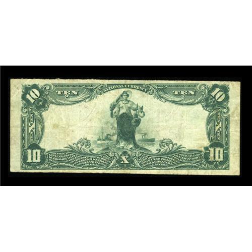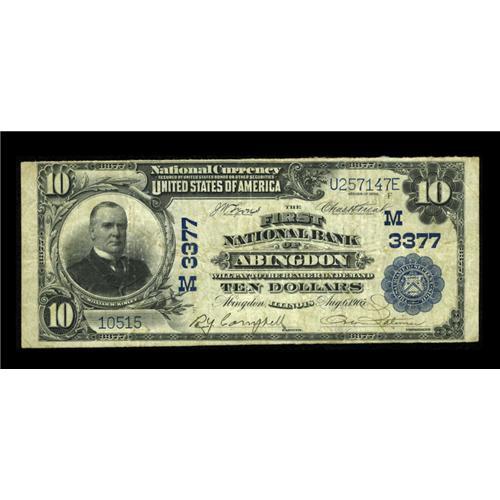 <B>Abingdon, IL</B></I> - $10 1902 Plain Back Fr. 625 <B>The First NB</B></I> Ch. # (M)3377<BR>This institution was the only issuing bank located in this Knox County locale and entered receivership in 1927. Kelly has traced twelve survivors. The example we offer here is an attractive <B>Fine</B></I> with dark ink signatures, albeit a touch flat.<BR><I>From The Lincoln Collection</B></I><BR><BR><b>Shipping:</b> Coins & Currency (<a target="_blank" href="http://www.heritageauctions.com/common/shipping.php">view shipping information</a>)