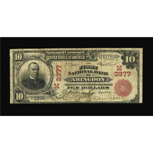 <B>Abingdon, IL</B></I> - $10 1902 Red Seal Fr. 614 <B>The First NB</B></I> Ch. # (M)3377<BR>A very scarce Red Seal from a bank which issued large notes only. <B>Very Good+,</B></I> ex-Lynn Shaw collection.<BR><I>From The Lincoln Collection</B></I><BR><BR><b>Shipping:</b> Coins & Currency (<a target="_blank" href="http://www.heritageauctions.com/common/shipping.php">view shipping information</a>)
