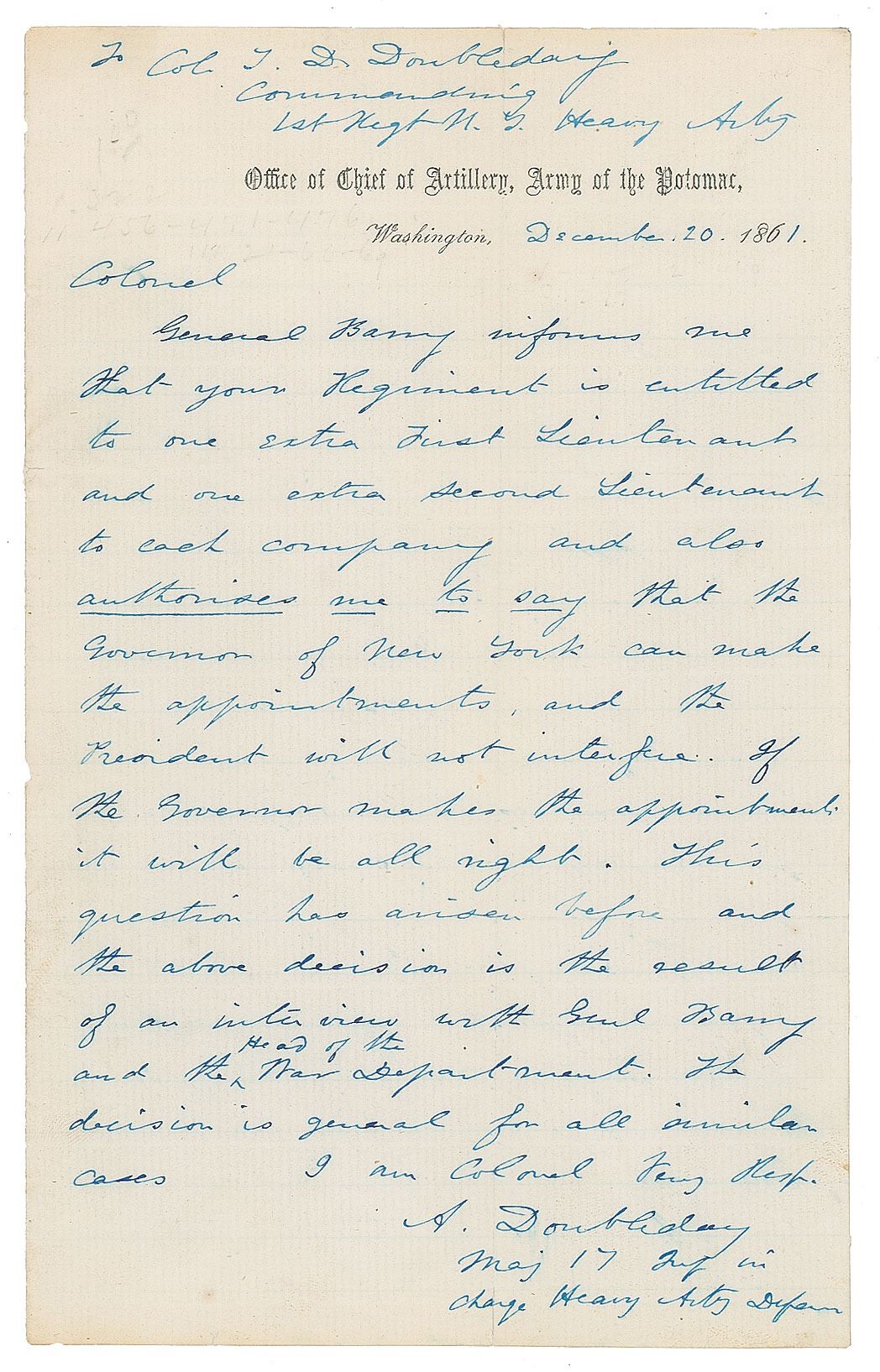 Union general (1819-1893) who commanded a division at Gettysburg; he has controversially been credited with the invention of baseball. Civil War-dated handwritten letter signed “A. Doubleday,” one page, 5 x 8, Office of Chief of Artillery, Army of the Potomac letterhead, December 20, 1861. Letter to his older brother, Colonel Thomas D. Doubleday, in full: "General Barry informs me that your Regiment is entitled to one extra First Lieutenant and an extra Second Lieutenant to each company and also authorizes me to say that the Governor of New York can make the appointments, and the President will not interfere. If the Governor makes the appointments it will be all right. This question has arisen before and the above decision is the result of an interview with Gen'l Barry and the Head of the War Department. The decision is general for all similar cases." In fine condition.