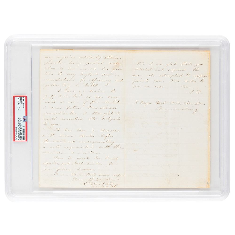 ALS signed “A. Doubleday, Maj. Genl. U.S.,†three pages on two adjoining sheets, 5 x 8, July 20, 1865. Handwritten letter to Major General Philip Sheridan, in full: “My brother Brevet Brig. Genl. U. Doubleday Comg 2d Brig. 2d Div. 25 Corps is stationed at Brazos Santiago under your command. If you will have any use for a good Spanish scholar you will find that he speaks and writes the language perfectly. He also speaks French and German and is a superior English scholar. In Florida he was Chief of Artillery & Chief Engineer. He is young, active and industrious and had always been regarded as a man of very superior scholarly attainments. Every general under whom he has served has given him the very highest recommendations for efficiency and gallantry in battle. I have no desire to puff him, but as you may need a man of this character in some future Mexican complication I thought I would mention the subject to you. He has been in Mexico on the Texan border before the war and consequently is well acquainted with their manners & customs. Mrs. D. sends her kind regards, and best wishes for your future success.†Doubleday adds initials, “A.D.,†to a postscript: “I am glad that you detected and exposed the man who attempted to appropriate your Five Forks to his own use.†In fine condition. Encapsulated in a PSA/DNA authentication holder.