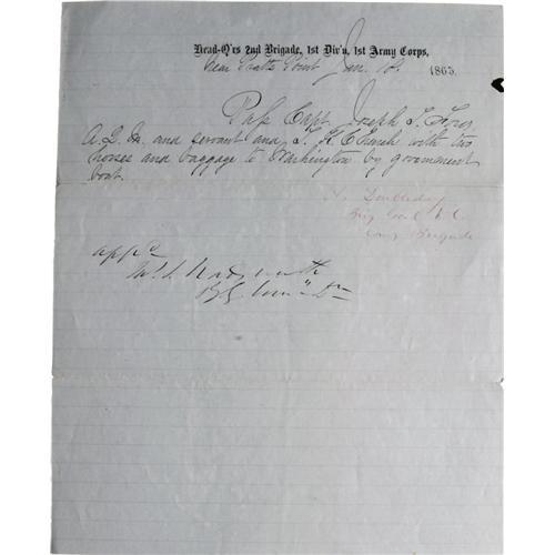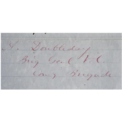 <B>Abner Doubleday Document Signed,</B></I> "<I>A. Doubleday</B></I>". One page on letterhead of "Head-Q'rs 2nd Brigade, 1st Dv'n, 1st Army Corps", 8" x 10", Pratt's Point, Virginia, January 18, 1863. Secretarially penned military papers reading, "Pass Capt. Joseph L. Ford, A.Q.M. and servant and L. K. Church with two horses and baggage to Washington by government boat." Doubleday, as a brigadier, signs in red ink on light blue paper. Smoothed folds with minute splits, else fine condition. Abner Doubleday (1819-1893) is largely credited with being the inventor of modern baseball. He was also a professional soldier, having graduated from West Point in 1842. He served in the Mexican War and saw active Civil War service from Fort Sumter to Gettysburg. Rising to major general, Doubleday held administrative posts until his retirement in 1873.<BR><BR><b>Shipping:</b> Small Flat (<a target="_blank" href="http://www.heritageauctions.com/common/shipping.php">view shipping information</a>)