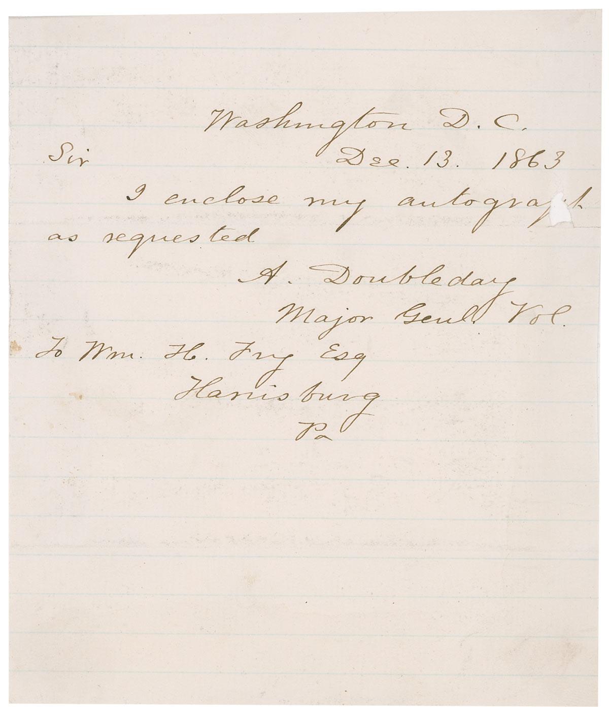 Union general (1819–1893), controversially credited with the invention of modern baseball, who was also the Union general who in 1863, as major general of volunteers, he commanded a division at Gettysburg, taking the high ground, leading 9,500 men against ten Confederate brigades that numbered more than 16,000. The high ground he held became decisive in winning the Battle of Gettysburg. War-dated ALS signed “A. Doubleday, Major Genl. Vol,” one page, lightly-lined, 5 x 5.75, December 13, 1863. Brief letter sending his autograph. In full: “I enclose my autograph as requested.” Doubleday has also written the recipient’s name and address under the body of the letter. Punch hole to right edge affecting a single word of text, some light creases, and mild toning from mounting remnants on reverse, otherwise fine condition. Doubleday assumed duties in the defenses of Washington, D.C., after the Battle of Gettysburg, where General Meade replaced Doubleday with John Newton. Scarce in war-dated material.