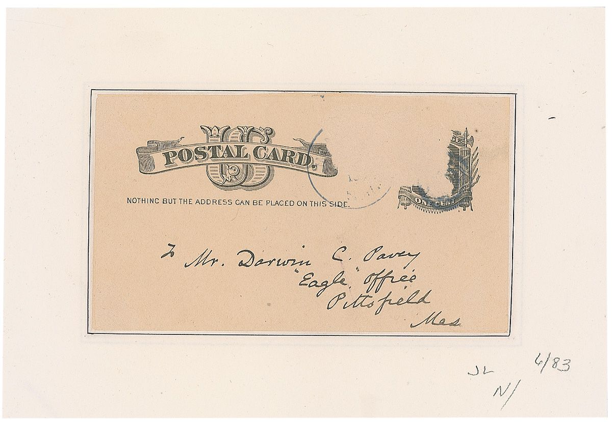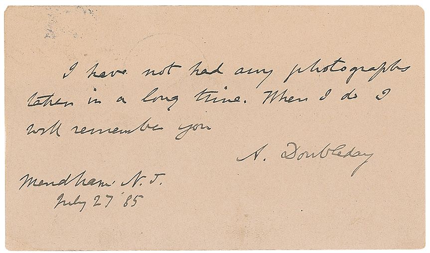 Union general (1819–1893). Famous for his association with the invention of the game of baseball. In April 1861, Doubleday served in the garrison at Fort Sumter, and he was said to have aimed the first gun to reply to the Confederate batteries. His greatest performance of the war came at Gettysburg when he assumed command of the 1st corps after the death of General John F. Reynolds. ANS signed “A. Doubleday,” on a 5 x 3 government postcard, July 27, 1885. Brief note to a collector. In full: “I have not had any photographs taken in a long time. When I do I will remember you.” Postcard is inlaid into a 7.25 x 5 off-white sheet. In fine condition, with a bit of scattered light soiling and a mild impression to upper portion of postcard from cancellation on reverse.