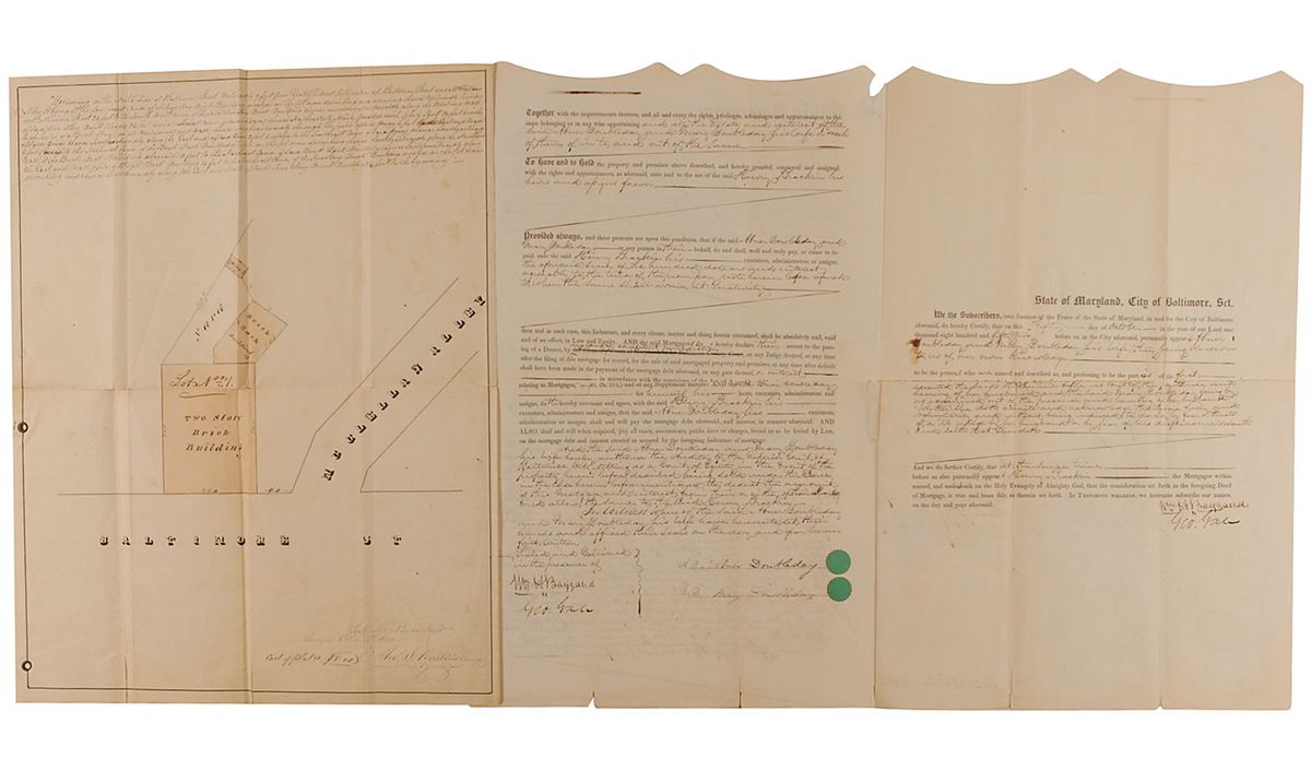 Partly-printed DS, three pages on two adjoining sheets, 10.75 x 16.5, October 5, 1852. Indenture document between Doubleday, his wife Mary, and Henry Brackin, for the sale of the Doubleday's property in Baltimore for the sum of $600 with the document providing detailed information about the property and the transaction. Also included is a surveyor's plot of the property owned by Doubleday and his wife, 16.5 x 13, giving an aerial view of the land at the corner of Baltimore St. and McClellan Alley. This plot includes measurements of the property as well as measurements of buildings on the grounds. Survey also bears a written description of all pertinent details about the property. Survey is docketed on the reverse and signed at the bottom by the surveyor, Alexander J. Bouldin. In very good condition, with a complete separation of the document’s central horizontal fold, a few other small separations along intersecting folds, pencil notations next to signature, a repaired tear to reverse, and scattered toning and creasing. Accompanied by a full letter of authenticity from PSA/DNA.