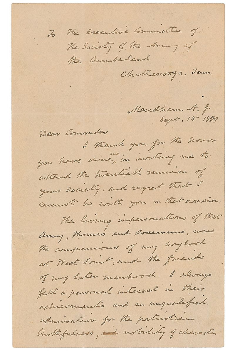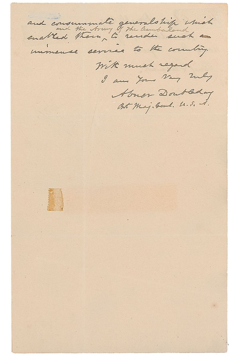 ALS signed “Abner Doubleday, Bvt. Maj. Genl. U. S.,” two pages on two adjoining sheets, 5 x 8, September 13, 1889. Letter to the Executive Committee of the Society of the Army of the Cumberland. In part: “I thank you for the honor you have done me in inviting us to attend the twentieth reunion of your Society, and regret that I cannot be with you on the occasion. The living impersonations of that Army, Thomas and Rosecrans, were the companions of my boyhood at West Point, and the friends of my later manhood. I always felt a personal interest in their achievements and an unqualified admiration for the patriotism, truthfulness, and nobility of character and consummate generalship which enabled them and the Army of the Cumberland to render such immense service to the country.” Intersecting folds, a small toned piece of tape affixed to second page, and show-through to second page from a ballpoint notation to reverse, otherwise fine condition. An outstanding and eloquent letter associating three of the most prominent generals of the Civil War.