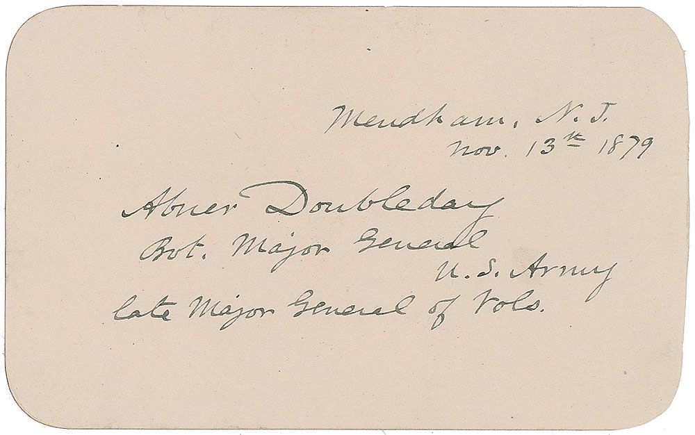 Union general (1819–1893) who commanded a division at Gettysburg; he has controversially been credited with the invention of baseball. Crisp ink signature, “Abner Doubleday, Bvt. Major General, U. S. Army, late Major General of Vols. Mendham, N. J., Nov. 13th 1879,” on an off-white 4.75 x 3 album page. In fine condition. Accompanied by a full letter of authenticity from JSA.