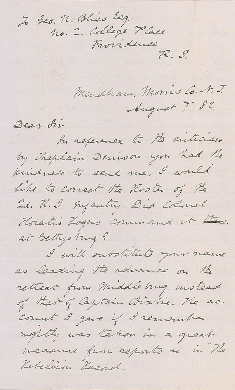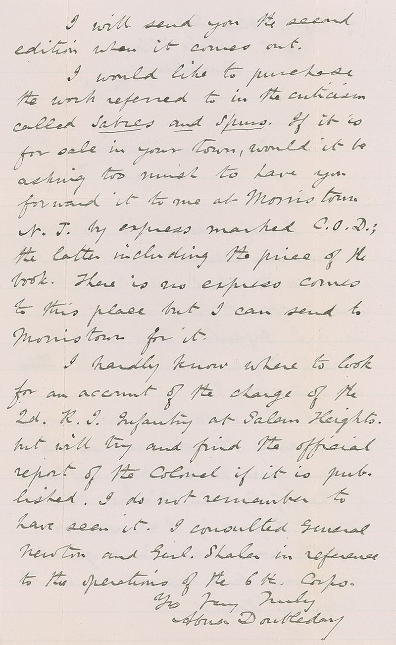 Union general (1819-1893) who commanded a division at Gettysburg and has controversially been credited with the invention of baseball. ALS, one page, both sides, 4.75 x 8, August 7, 1882. Letter to George Bliss who led the 1st Regiment of the R.I. Cavalry in the Battle of Middleburg, June 17–19, 1863, part of the Gettysburg campaign. In part: “In reference to the criticism by Chaplain Denison you had the kindness to send me, I would like to correct the Roster of the 2d. R. I. Infantry. Did Colonel Horatio Rogers command it at Gettysburg? I will substitute your name as leading the advance on the retreat from Middleburg instead of that of Captain Bixbie. The account I gave if I remember rightly was taken in a great measure from reports in The Rebellion Record…I would like to purchase the work referred to in the criticism called Sabres and Spurs. If it is for sale in your town, would it be asking too much to have you forward it to me at Morristown N. J. by express marked C. O. D…I hardly know where to look for an account of the charge of the 2d. R. I. Infantry at Salem Heights but will try and find the official report of the Colonel if it is published…I consulted General Newton and General Shaler in reference to the operations of the 6th Corps.” In fine condition, with intersecting folds. Letter originates from the Collection of Elisha Hunt Rhodes.