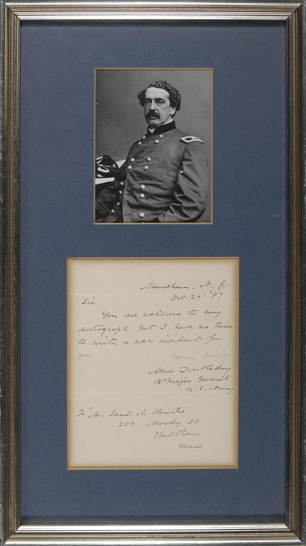 Union general (1819–1893), controversially credited with the invention of modern baseball. ALS signed “Abner Doubleday, Bvt. Major General, U. S. Army,” one page, 5 x 6, October 24, 1887. Short letter to a collector. In full: “You are welcome to my autograph but I have no time to write a war incident for you.” Matted and framed with a portrait of Doubleday in uniform, to an overall size of 8.5 x 15.5. Accompanied by a letter of authenticity from James Spence. A light overall shade of toning, heavier at edges, otherwise fine condition. Pre-certified PSA/DNA and RRAuction COA.