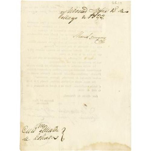 <B>Decree Abolishing an Excise House in Coahuila and Texas</B></I> Signed "<I>Juan Martin de Veramendi</B></I>" in type and, on verso, "<I>Manuel Jimenez</B></I>" in ink, one page, 5.75" x 8". Monclova, April 19, 1833. In this printed decree, Governor Juan Martin de Veramendi authorizes a Decree of the Congreso Constitucional, approved by Dionicio Elizondo, president of Congress, directing that the receiver's office of excise duties established at San Isidro de Palomas be abolished (Article 1), that Decrees 132 and 141 of April 1830 establishing that office be repealed (Article 2), and that the executive should dictate the necessary measures to carry out this law (Article 3). On verso is a manuscript notation signed by Manuel Jimenez, first regidor and acting<I> </B></I>alcalde of Bexar. At the bottom of the page is "<I>Dios</B></I>" (God) with "<I>y Libertad</B></I>" (and Freedom) penned atop verso followed by Bexar, May 15, 1833, directing that this be sent to Goliad. Not a Samuel Bangs imprint, but probably printed on his press by another printer after the press was sent to Monclova when the capital was moved to Saltillo. The printing is typical of the somewhat irregular quality of Bangs' types and print. Blank margins trimmed, soiled at bottom. Fine condition.<I> From the collection of Darrel Brown.</B></I><BR><BR><B>Reference:</B></I> Not in Streeter. Cited as Decree 221 in Kimball's Laws and Decrees, 1839, p. 210. <BR><BR><b>Shipping:</b> Flat Material, Small (<a target="_blank" href="http://www.heritageauctions.com/common/shipping.php">view shipping information</a>)