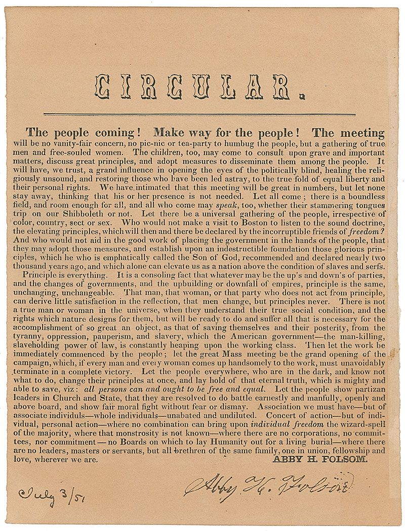 Original printed circular by Abby H. Folsom announcing an abolitionist meeting in Boston, one page, 7.5 x 9.75, bearing an ink notation to the lower border, “July 3/51.” In part: “Let there be a universal gathering of the people, irrespective of color, country, sect or sex. Who would not make a visit to Boston to listen to the sound doctrine, the elevating principles, which will then and there be declared by the incorruptible friends of freedom?…all persons can and ought to be free and equal.” In fine condition, with mounting remnants to the right border.