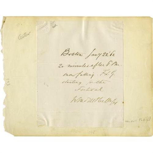 <B>Abolitionist Wendell Phillips Autograph Note Signed</B></I> “<I>Wendell Phillips</B></I>”. 4.5” x 5.5”, Boston, January 22, 1862, mounted on larger paper backing sheet, ink slightly faded, paper cockled at mounting points, else very good. Phillips writes: “<I>20 minutes after 6 p.m. Snow falling. F.L.G. starting for the festival.</B></I>” Wendell Phillips (1811-1884) was a noted American abolitionist and early human rights advocate. <I>Ex. Henry E. Luhrs Collection.</B></I> <BR><BR><b>Shipping:</b> Flat Material, Small (<a target="_blank" href="http://www.heritageauctions.com/common/shipping.php">view shipping information</a>)