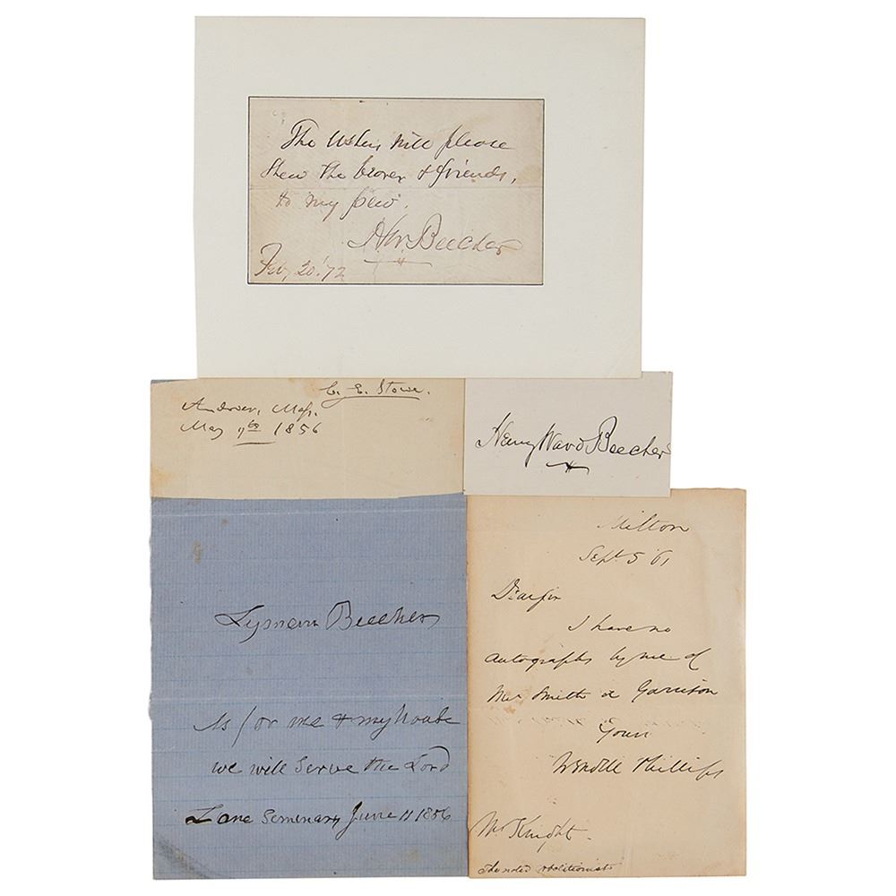 Group lot of five items signed by a notable abolitionist: Henry Ward Beecher (2: signature and ANS), Lyman Beecher (AQS), Wendell Phillips (ALS), and Calvin Ellis Stowe (signature, which is affixed to the top of the Lyman Beecher sheet). In overall fine condition.