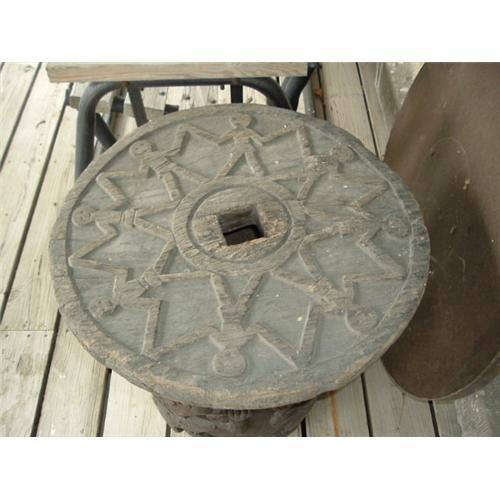 This wooden wheel was part of a small cart from the Rukai tribe of Formosan aborigines. Estimated age about 100 years (the use of a cart shows the early Japanese influence on the aborigine way of life). The piece is 21.5" in diameter and 2" thick with a cneter hole for the axle. 8 warriors are carved on the face of the wheel.