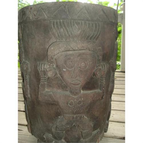 Rukai tribe of Formosan aborigines. This piece is a section of hollowed log used for storing maize or other grain. Excellent condition w/the bottom intact. Has 4 warrors carved around the outside surface. 17" diameter x 25" high (footed)