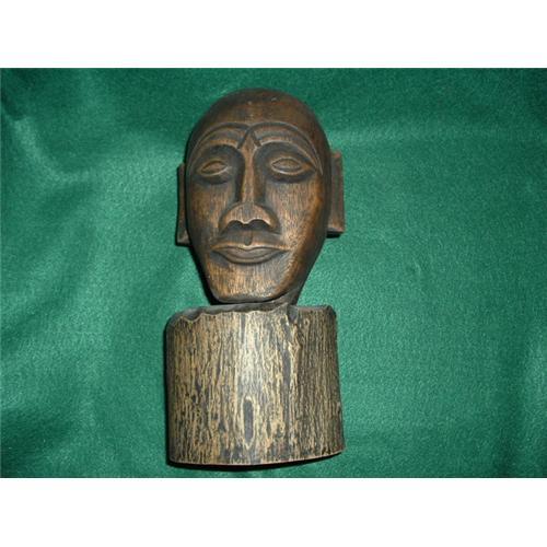 3-dimensional carving of Formosan male (Paiwan tribe) mounted on piece of tree round. Head is 8"H x 7"W, stand is 5"H x 6"D