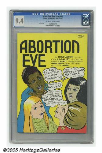 <B>Abortion Eve #1 (Nanny Goat, 1973) CGC NM 9.4 Off-white to white pages.</B></I> An early feminist comic discussing the pros and cons of abortion, with an original print run of 20,000. Lyn Chevle art is featured. CGC census 3/05: 1 in 9.4, none higher.