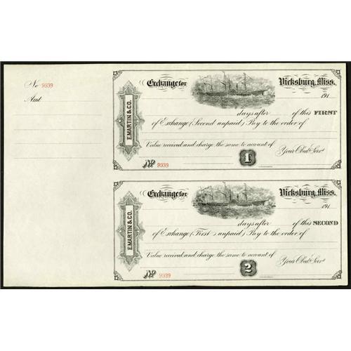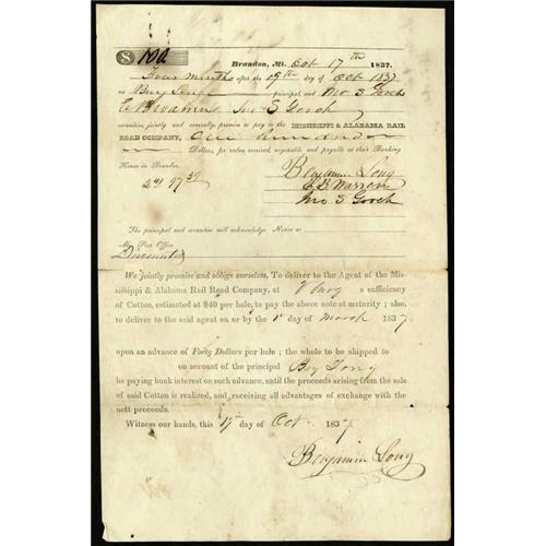 <B>Mississippi Paper Potpourri.</B></I> This interesting lot has an October 1837 promissory note to the Mississippi & Alabama Railroad Co. of Brandon, two sheets of three unused 19__ checks payable at the Merchants & Farmers Bank of Columbus, two 1880s letterheads from Holly Springs, four 1860s summons from Madison County with a check attached to each, a April 1836 loan agreement with the Agricultural Bank of Mississippi (Natchez), an unused 191_ First and Second Exchange on E. Martin & Co of Vicksburg, and a sheet of three checks dated October 1845 from Woodville. There are also three miscellaneous paper items from Holly Springs, Natchez, and Pass Christian. <I>There will be no returns on this lot for any reason.</B></I><BR>