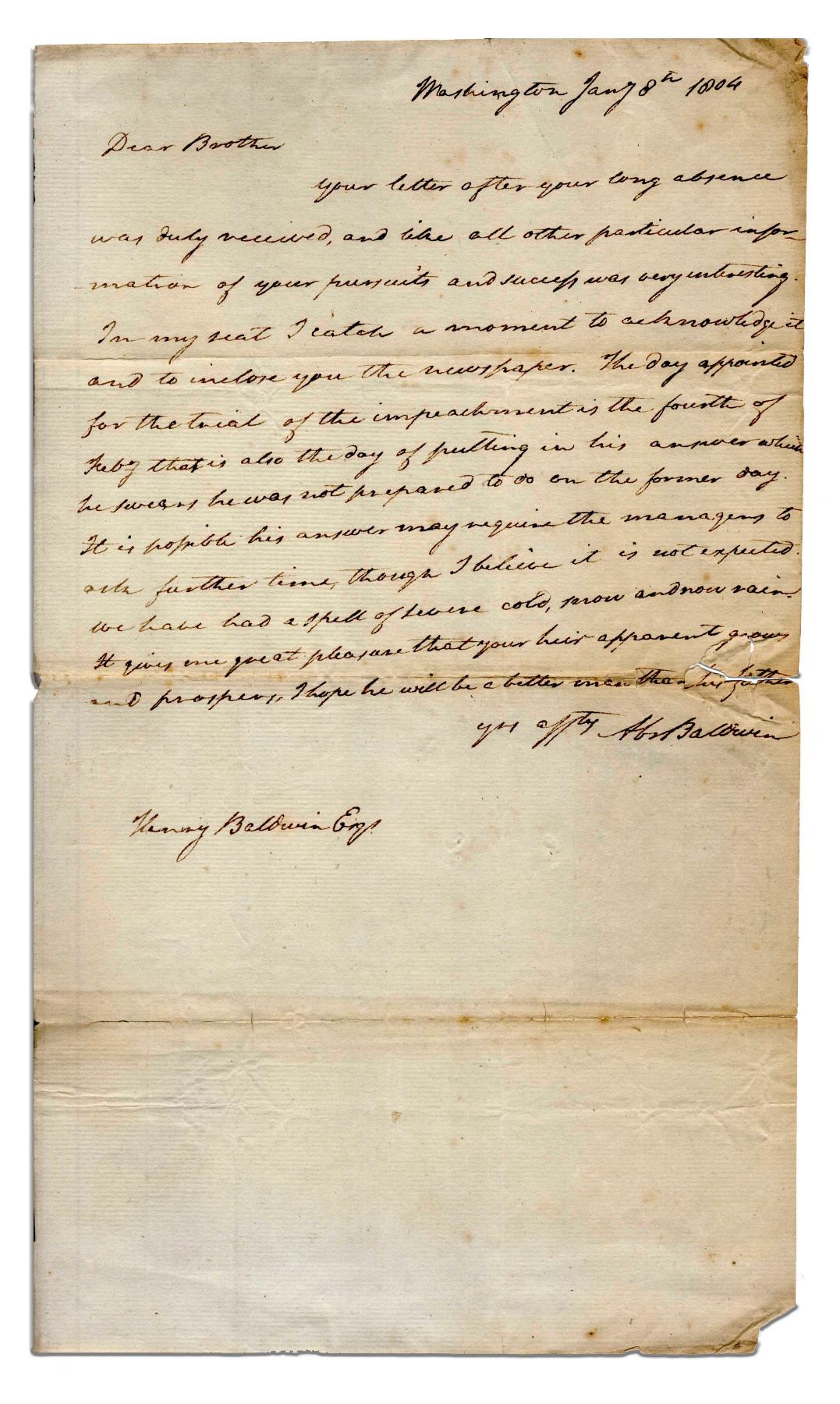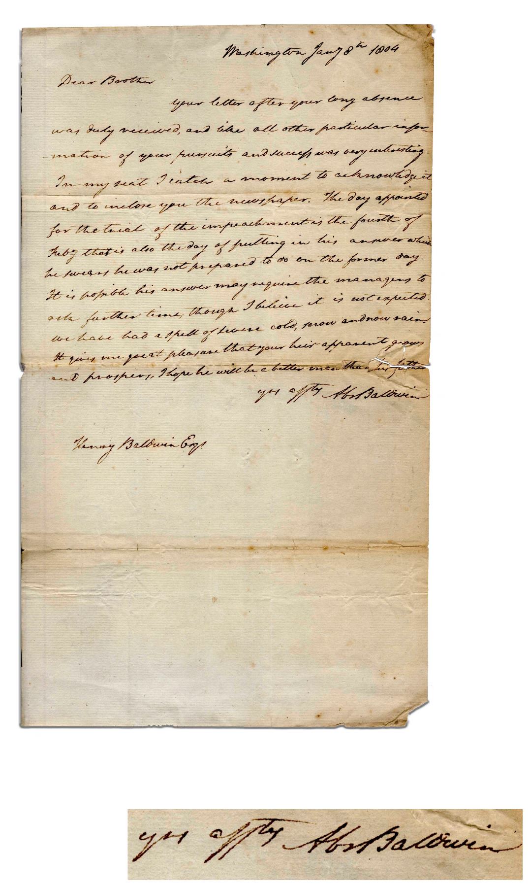 Abraham Baldwin autograph letter signed with rare content on the impeachment trial of Supreme Court Justice Samuel Chase. Datelined Washington, 8 January 1805 (Baldwin mid-dates the year as 1804), Baldwin writes to his brother Henry while serving as U.S. Senator from Georgia. In part, ''...The day appointed for the trial of the impeachment is the fourth of Feby that is also the day of putting in his answer which he swears he was not prepared to do on the former day. It is possible his answer may require the managers to ask further time though I believe it is not expected...Abr Baldwin''. On 1 March 1805 the U.S. Senate voted to acquit Chase of impeachment (after the House voted for impeachment), thereby deeply establishing the independence of Supreme Court Justices. Single page letter measures 7.75'' x 13''. Closed tear at right edge, partially affecting signature. Overall very good condition.