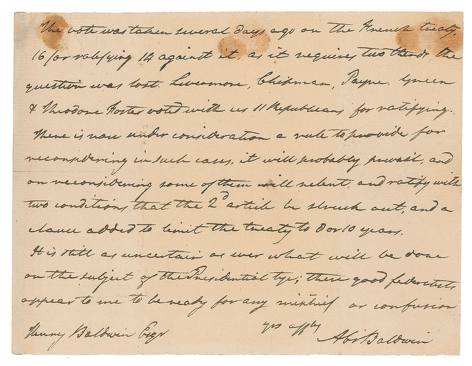 ALS signed “Abr. Baldwin,” one page, 7.75 x 6, no date. Letter to his half-brother, Henry Baldwin, an Associate Justice of the Supreme Court of the United States, in full: "The vote was taken several days ago on the French treaty, 16 for ratifying 14 against it, as it requires two thirds the question was lost Livermore, Chipman, Payne, Green & Theodore Foster voted with us 1 Republicans for ratifying. There is now under consideration a vote to provide for reconsidering in such cases, it will probably prevail, and on reconsidering some of them will relent, and ratify with two conditions that the 2d article be struck out, and a clause added to limit the treaty to 8 or 10 years. It is still as uncertain as ever what will be done on the subject of the Presidential tye; there good federalists appear to me to be ready for any mischief or confusion." In fine condition, with several circular stains along the top.