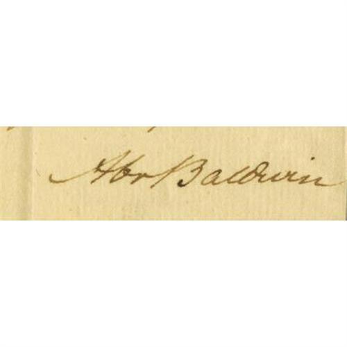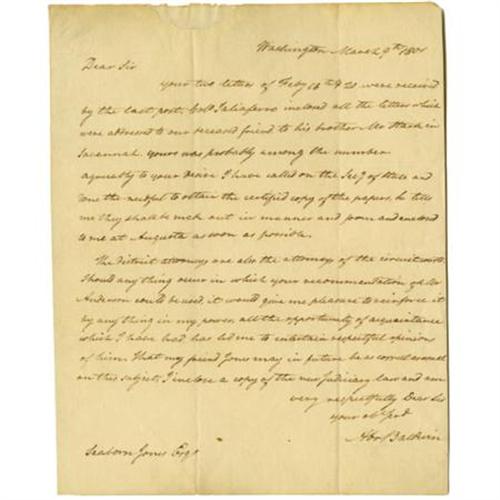 <B>Abraham Baldwin Autograph Letter Signed</B></I> "<I>Abr Baldwin,</B></I>" one page, 8" x 10". Washington, March 9, 1801. To Seaborn Jones Esq. In part, "<I>Agreeably to your desire I have called on the Secy of State and done the needful to obtain the certified copy of the papers, he tells me they shall be much out in manner and form and enclosed to me at Augusta as soon as possible. The district attorneys are also the attorneys of the circuit courts. Should any thing occur in which your recommendation of Mr Anderson could be used, it would give me pleasure to reinforce it by any thing in my power, all the opportunity of acquaintance which I have had has led me to entertain respectful opinions of him. That my friend Jones may in future be as correct as usual on this subject, I inclose a copy of the new Judiciary law…</B></I>" Seaborn Jones (1759-1815) was a Revolutionary soldier, clerk of the executive council of Georgia in 1782, and Speaker of the Georgia House in 1789. Abraham Baldwin (1754-1807), a signer of the Constitution, was a member of the Continental Congress in 1785, 1787, and 1788. Author of the charter of the University of Georgia and its first president from 1786-1801, Baldwin represented Georgia is the U.S. House (1789-1799) and Senate (1799-1807). A portion torn out at the top blank edge has been repaired on verso. A mounting strip has been affixed along the edge of the blank integral leaf. Baldwin is extremely scarce in any form and is one of the rarest of the signers of the Constitution. This letter is in very fine condition.<BR><BR><b>Shipping:</b> Flat Material, Small (<a target="_blank" href="http://www.heritageauctions.com/common/shipping.php">view shipping information</a>)