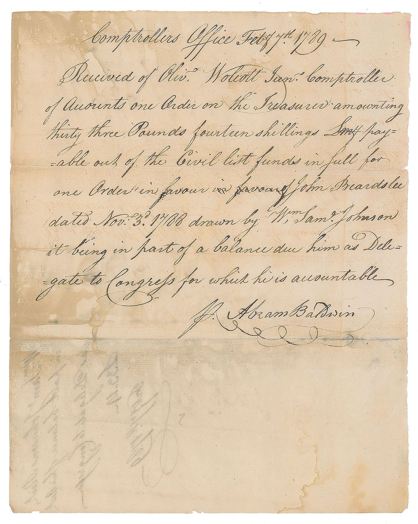 American minister, politician, and Founding Father (1754–1807) who served in both the senate and congress on behalf of Georgia, and was the President pro tempore of the United States Senate. Rare manuscript DS, signed "Abram Baldwin," one page, 7.5 x 9.5, February 7, 1789. In full: “Received of Oliv’r. Wolcott Jun’r. Comptroller of Accounts one Order on the Treasurer amounting thirty three Pounds fourteen shillings payable out of the Civil list funds in full for one Order in favour of John Beardslee dated Nov’r: 3d. 1788 drawn by Wm. Saml. Johnson it being part of a balance due him as Delegate to Congress for which he is accountable.” Signed at the conclusion by Baldwin. In very good condition, with light staining and reinforcements to splitting along folds. After graduating from Yale in 1772, Baldwin remained at the school to focus on theology and became a minister just three years later. Instead of leaving the school to focus on the ministry, Baldwin stayed at Yale as a tutor, earning a reputation as a great motivator of his students, a group which included Noah Webster and Oliver Wolcott, Jr.