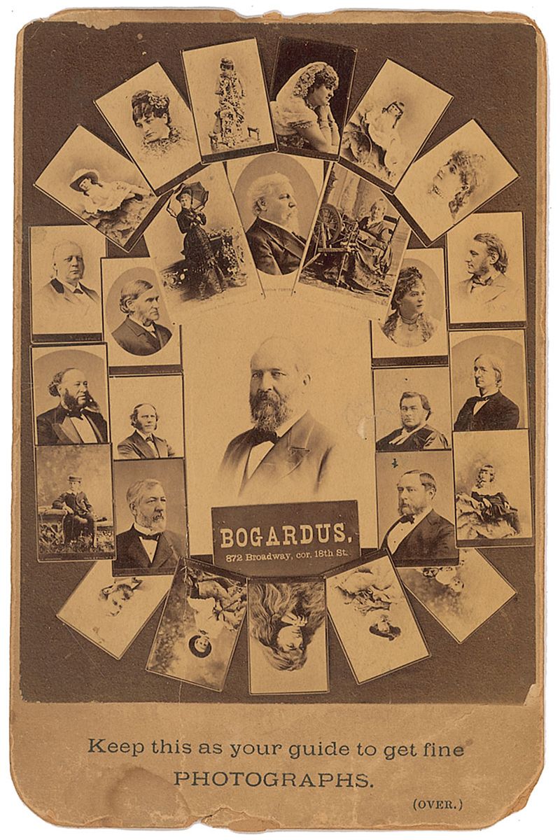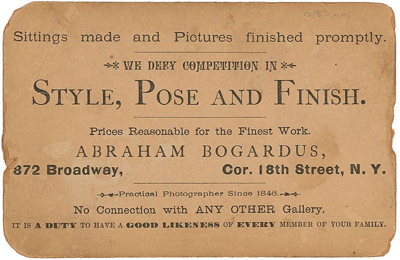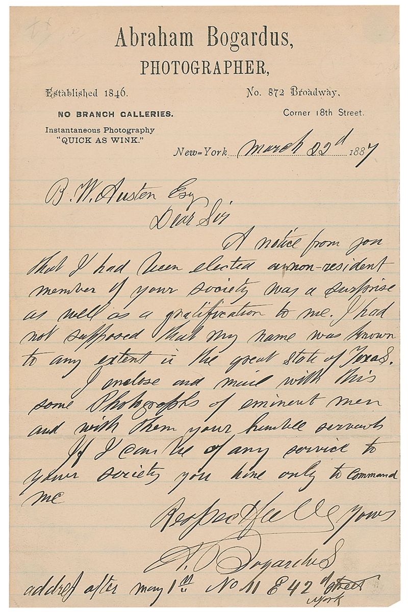 Prolific American daguerreotypist and photographer (1822–1908). ALS signed “A. Bogardus,” one page, lightly-lined, 5.5 x 8.5, personal letterhead, New York, March 22, 1887. Letter to a gentleman. In part: “A notice from you that I had been elected as a non-resident member of your society was a surprise as well as a gratification to me. I had not supposed that my name was known to any extent in the great state of Texas. I enclose and mail with this some photographs of eminent men.” In fine condition, with light wrinkling to upper corners from adhesive residue to reverse. Accompanied by an unsigned original cabinet photo advertising Bogardus’s studio.