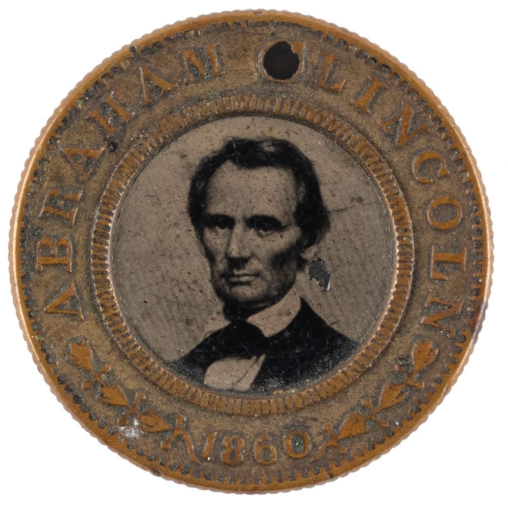 Very desirable ferrotype button from the 1860 presidential campaign, 1Ë in diameter, featuring a portrait of a beardless Abraham Lincoln on one side, with his vice presidential running mate Hannibal Hamlin on the other. Their portraits are encircled with raised text, "Abraham Lincoln, 1860" and "Hannibal Hamlin, 1860." In fine condition, with Hamlin's image slightly blurry, and a speck of emulsion loss to each.