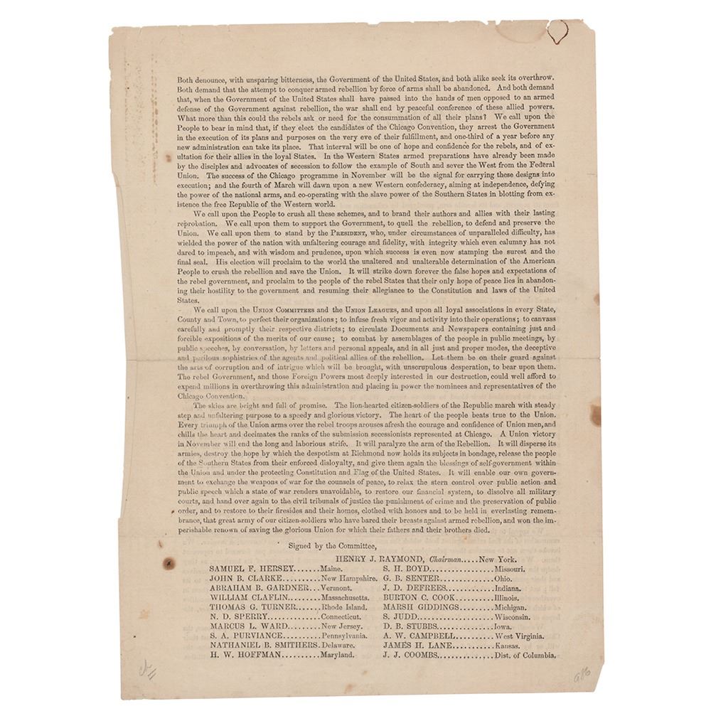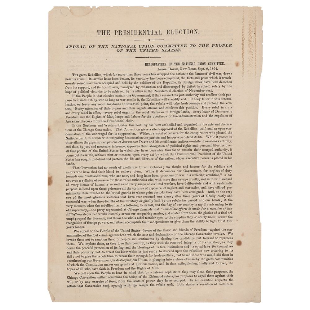 Interesting original campaign leaflet issued by the National Union Committee prior to the 1864 presidential election, one page both sides, 8 x 11.25, September 9, 1864. Headed "The Presidential Election: Appeal of the National Union Committee to the People of the United States," the dramatic text reads, in small part: "The great Rebellion, which for more than three years has wrapped the nation in the flames of civil war, draws near its crisis. Its armies have been beaten, its territory has been conquered, the forts and posts which it treacherously seized have been occupied and held by the soldiers of the Republic, its foreign allies have been detached from its support, and its hostile arm, paralyzed by exhaustion and discouraged by defeat, is upheld solely by the hope of political victories to be achieved by its allies in the Presidential election of November next. If the People in that election sustain the Government, if they reassert its just authority and reaffirm their purpose to maintain it by saw so long as was assails it, the Rebellion will speedily end. If they falter in this determination, or leave any room for doubt on this vital point, the rebels will take fresh courage and prolong the contest. Every utterance of their organs and their agents affirms and confirms this position. Every rebel in arms and every rebel in office‰ÛÓevery rebel organ in the rebel States or in foreign lands‰ÛÓevery hater of Democratic Freedom and the Rights of Man, longs and labors for the overthrow of the Administration and the expulsion of Abraham Lincoln from the presidential chair." In very good to fine condition, with some creasing, light staining, and short edge tears.