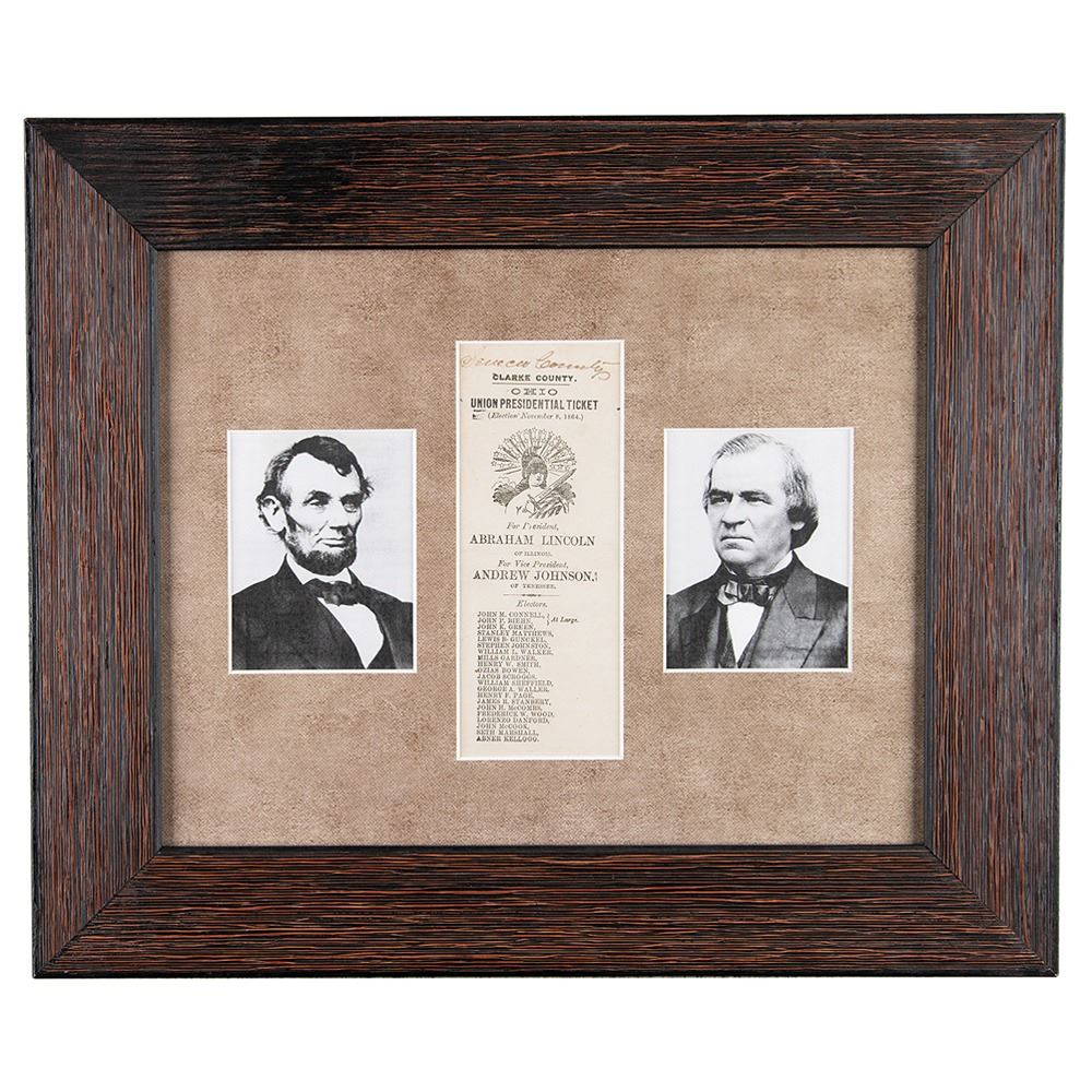 Union Presidential Ticket for the November 8, 1864, election in Seneca County, Ohio, 3 x 7, featuring the text, "For President, Abraham Lincoln of Illinois, For Vice President, Andrew Johnson of Tennessee," and providing a list of electors. An unknown hand has crossed out the printed "Clarke," and written "Seneca County" across the top. Handsomely archivally matted and framed with portraits of Lincoln and Johnson to an overall size of 18 x 15. In fine condition.