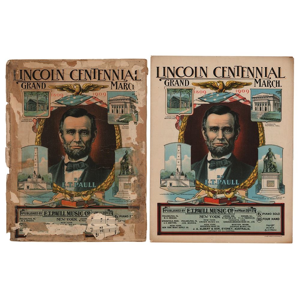 Two sheet music booklets for the "Lincoln Centennial Grand March," eight pages, 10.5 x 13.75, published in 1909 by E. T. Paull, featuring a colorful lithographed cover depicting President Abraham Lincoln, his birthplace, his tomb, the emancipation statue in Washington, and the Lincoln Memorial. One is in fine condition; the other is in good condition, with heavy wear and losses, tape reinforcements to edges, and various tears and creases.