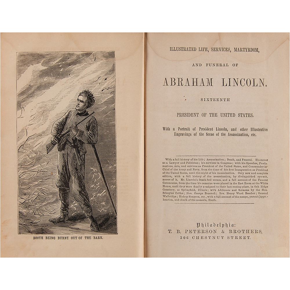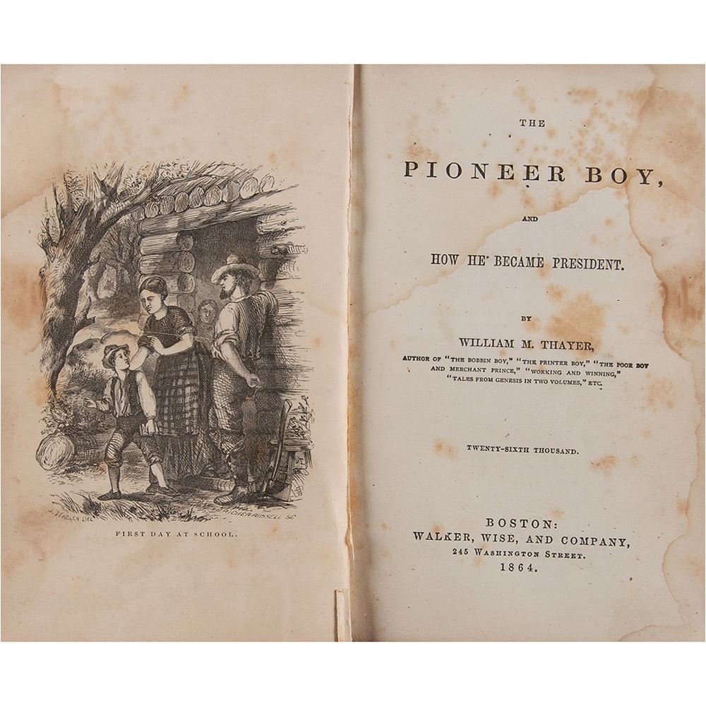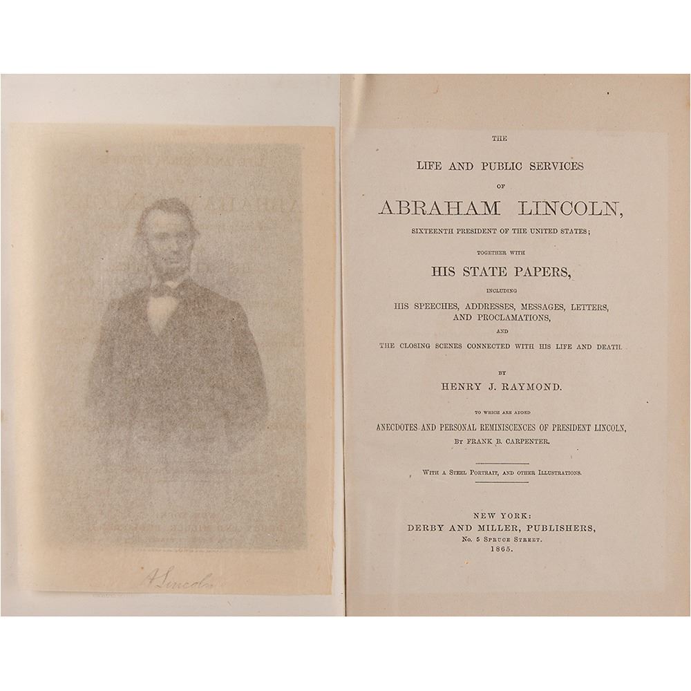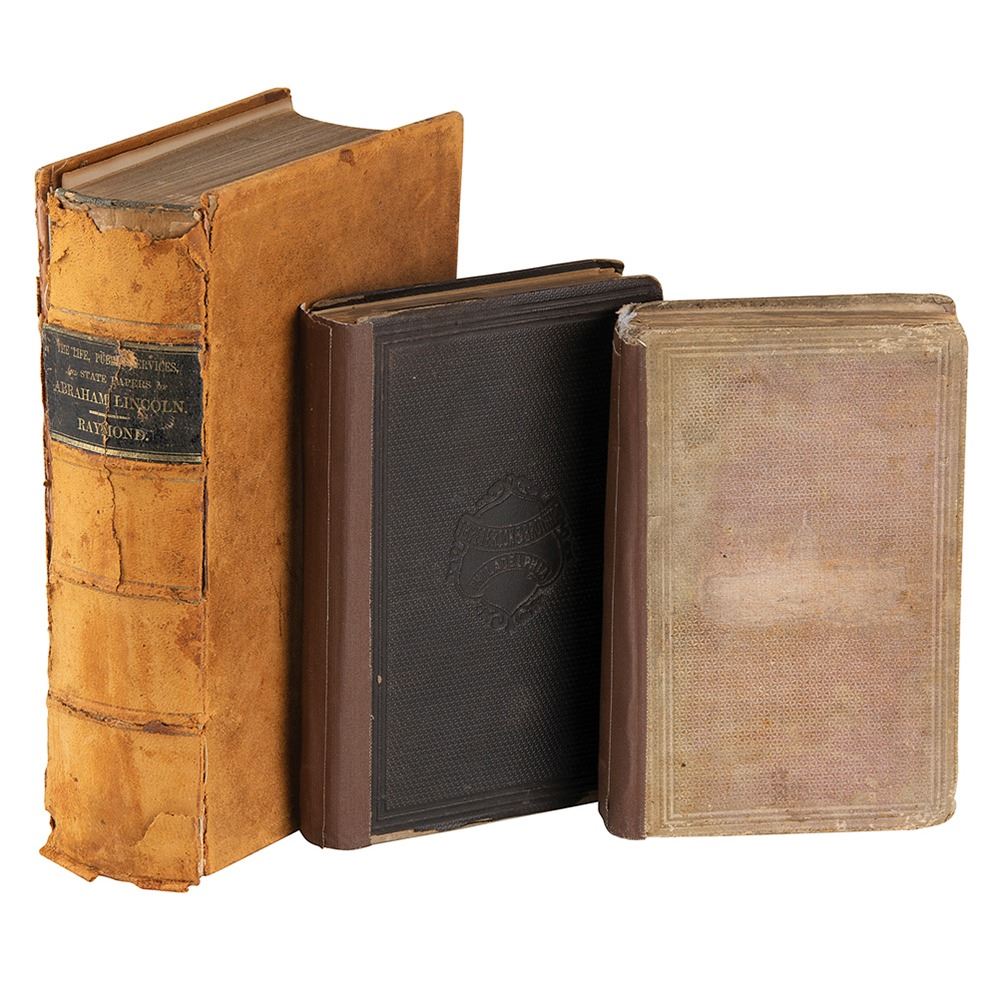 Three mid-1860s hardcover historical biographies of President Abraham Lincoln, including: The Pioneer Boy, and How He Became President, by William M. Thayer, published in Boston by Walker, Wise and Company in 1864; Illustrated Life, Services, Martyrdom, and Funeral of Abraham Lincoln, Sixteenth President of the United States, published in Philadelphia by T. B. Peterson & Brothers in 1865; and The Life and Public Service of Abraham Lincoln, Sixteenth President of the United States; Together with His State Papers, by Henry J. Raymond, published in New York by Darby and Miller in 1865. In overall good to very good condition, with spine repairs and dampstaining to The Pioneer Boy and the Illustrated Life, cracked joints/hinges and detached endpapers to The Life and Public Service, and general wear throughout.