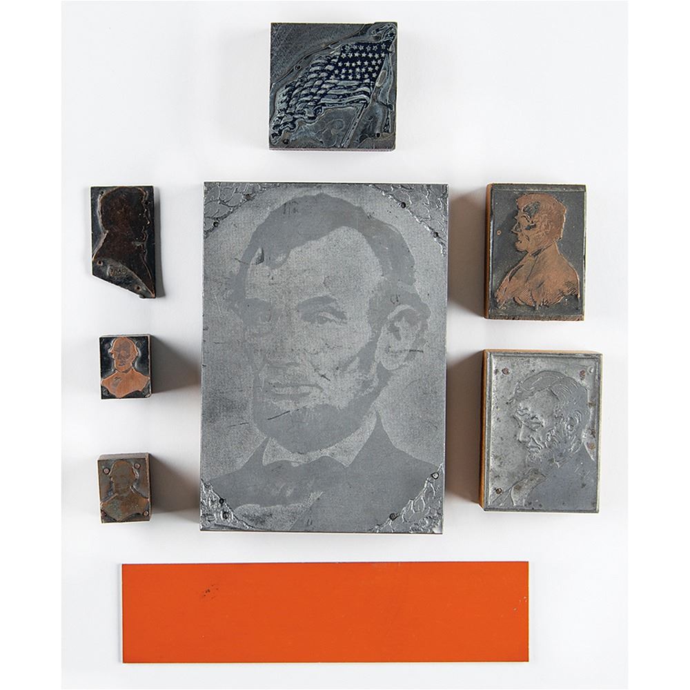 Group of eight printing blocks and plates affiliated with President Abraham Lincoln, including seven metal plates mounted on wooden blocks, plus a smaller metal plate of Lincoln's silhouette, and a printing plate for a "Lincoln Funeral Car Souvenir, 42nd National Encampment, G.A.R." The rest of the group consists of five portraits of Lincoln, plus one image of an American flag. Sizes range from .75Àù x 1Àù to 4Àù x 6Àù. In overall fine condition.
