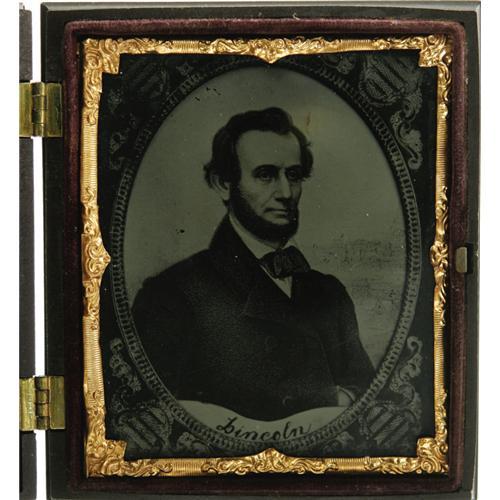 <B>Abraham Lincoln: A Spectacular Ruby Ambrotype of a Printed Lincoln Portrait.</B></I> "Lincoln" appears below his bearded bust, an image similar to that seen on some patriotic envelopes issued in the midst of the Civil War. The portrait is an oval surrounded by an elaborate decorative border. One might presume this to be a unique image made for an individual customer, but in fact there is strong reason to believe that it is a commercial product. Our June 7th 2006 Americana auction included an ambrotype of John C. Frémont in highly similar format (lot #25363). At the time we speculated that the Fremont might be an 1856 campaign item. However, the appearance of this Lincoln example suggests that both may have been part of a series featuring Lincoln and prominent Union generals, such as the tintype set produced by Abbott. Another intriguing possibility suggests itself: perhaps these are 1864 campaign items, as both Lincoln and Fremont were presidential candidates, along with McClellan, that year. The fact that we have not seen similar image for other Civil War personalities might tend to support the latter theory. <BR><BR>Condition is luminous and beautiful, overall very choice. Careful examination discloses a couple of tiny areas of missing emulsion in the field, but Lincoln's image is flawless. It is housed in a rare style of thermoplastic case featuring a seated figure of Ms. Liberty surrounded by a steam locomotive and other symbols of American industry and prosperity. Like the ambrotype, the case is in beautiful condition. <I>From the collection of Stanley King.</B></I> Measures 2.75" x 3.25" (ambrotype only). Overall measurements of open case: 7.5" x 3.75".<BR><BR><b>Shipping:</b> Small Collectibles (<a target="_blank" href="http://www.heritageauctions.com/common/shipping.php">view shipping information</a>)