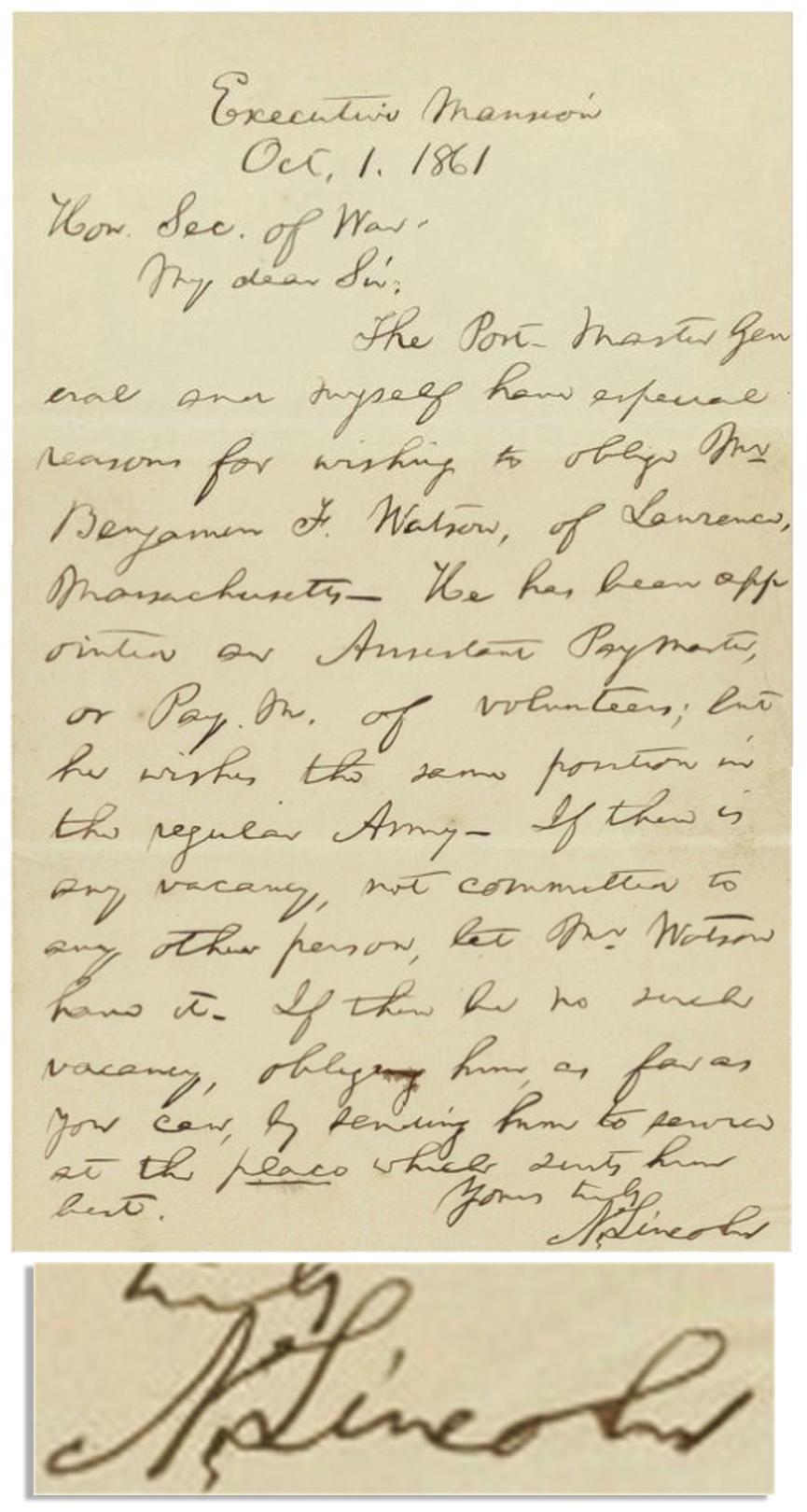 Abraham Lincoln autograph letter signed as President, dated 1 October 1861, to Secretary of War Simon Cameron. From the Executive Mansion, Lincoln entreats Cameron to help Benjamin F. Watson, a Minuteman from Massachusetts' 6th Infantry, to find a new job in the Army after his 90 day service expired. In full, ''My Dear Sir: The Post-Master General and myself have especial reasons for wishing to oblige Mr. Benjamin F. Watson, of Lawrence, Massachusetts. He has been appointed an Assistant Paymaster or Pay. M. of Volunteers; but he wishes the same position in the regular Army. If there is any vacancy, not committed to any other person, let Mr. Watson have it. If there be no such vacancy, oblige him as far as you can, by sending him to service at the place which suits him best. Yours truly, A. Lincoln''. Watson had been a Postmaster in Lawrence, Massachusetts under Presidents Pierce and Buchanan, but lost that position when he accepted a commission as Lt. Colonel in the Sixth Massachusetts Infantry -- the Minutemen of '61, a 90-day regiment that was the first to heed the urgent call for service by Lincoln in April 1861 (it had actually been organized in January 1861 in preparation for possible war). When Watson's 90-day service was up he found himself out of a job, thus Lincoln's unusual intercession on his behalf. After Watson's service as Paymaster ended in 1864, he would return as Postmaster to Lawrence, Massachusetts, where he also purchased the Lawrence Sentinel newspaper. This handwritten letter measures approximately 8'' x 10'' and bears a Philp & Solomons stationers seal at top left. In near fine condition with no notable defects. Single page with blank integral leaf, ideal for framing. An exceptional and moving war-dated letter by President Lincoln.