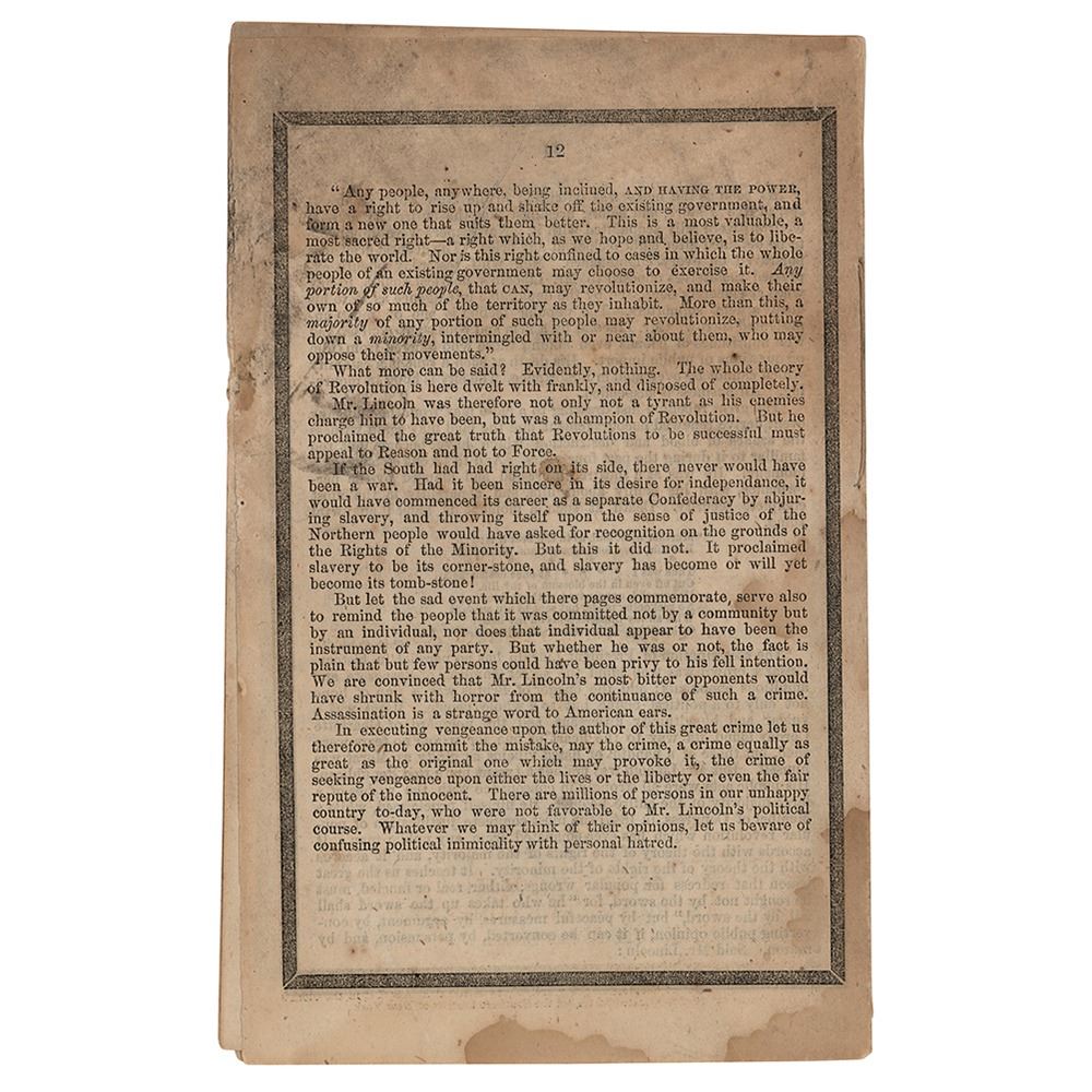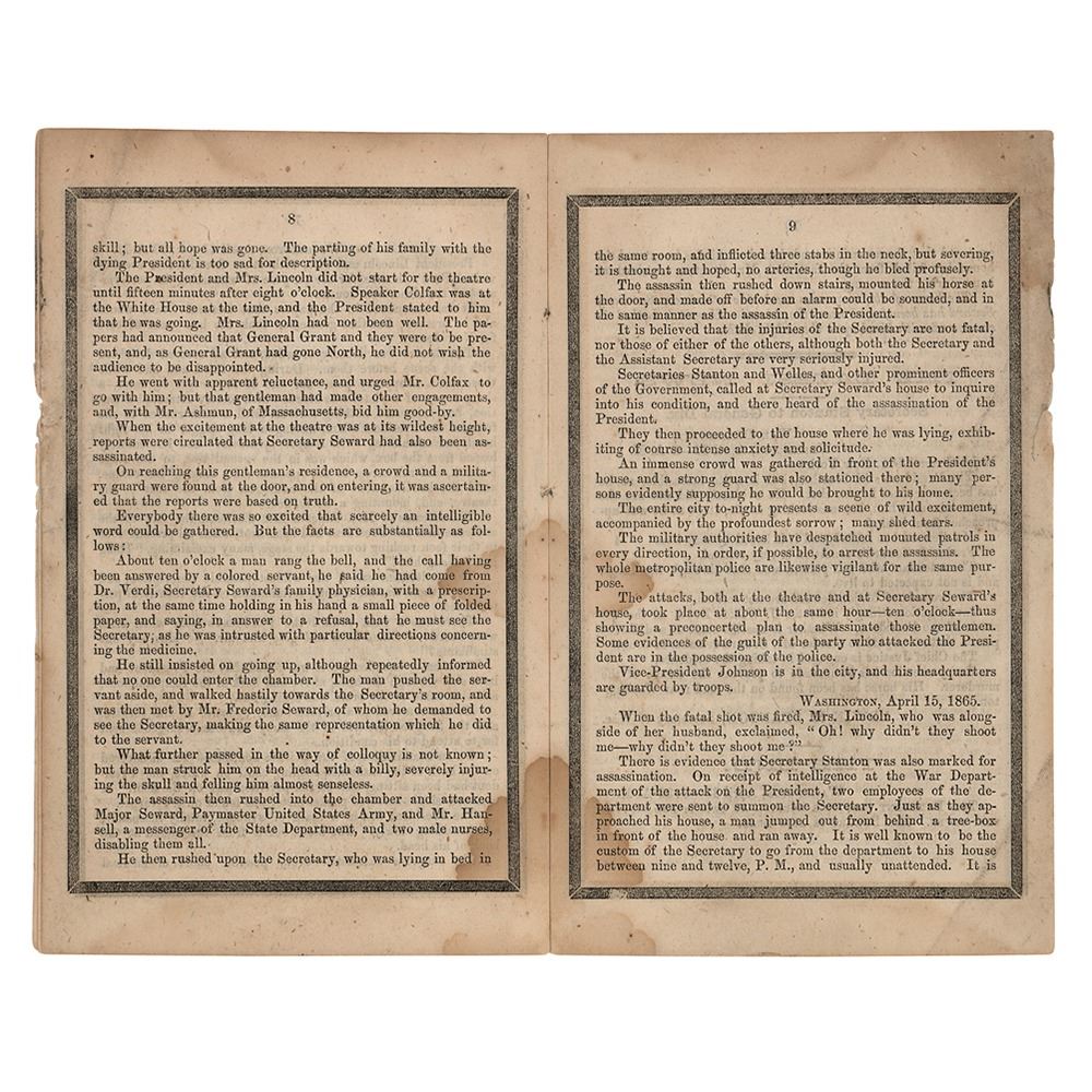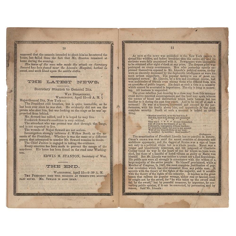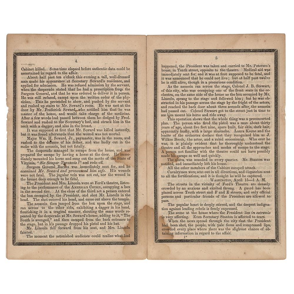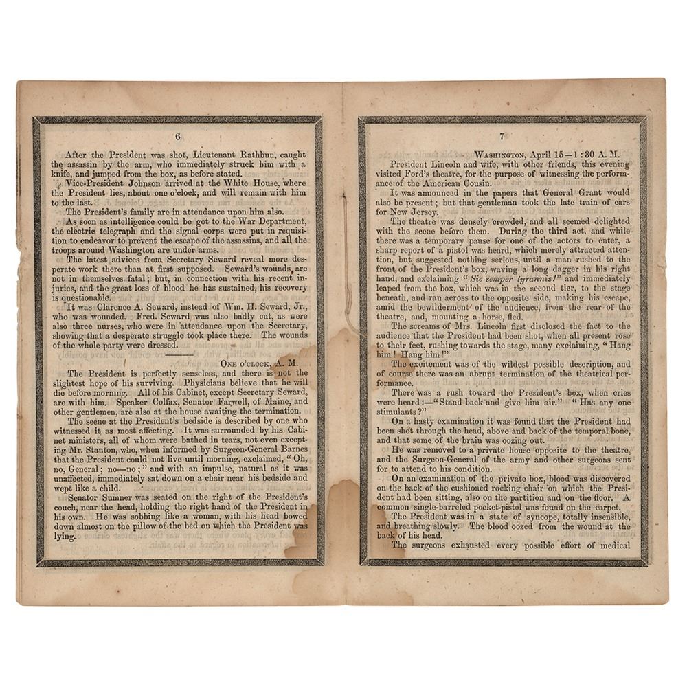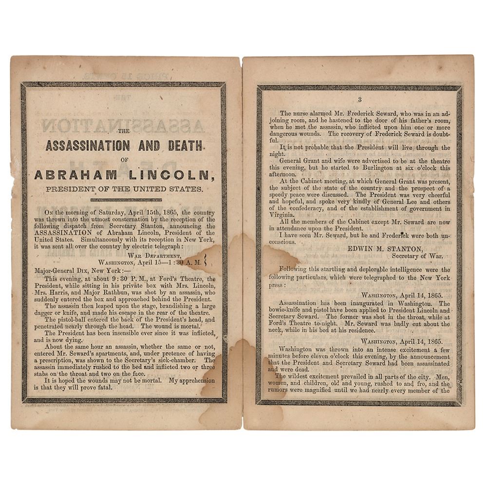 Scarce booklet entitled "The Assassination and Death of Abraham Lincoln, President of the United States of America, At Washington, on the 14th of April, 1865," by Abott A. Abott, published in New York in 1865 by the American News Company, 12 pages, 4.5 x 7.5, containing transcripts of Secretary of War Edwin M. Stanton's announcement of President Lincoln's assassination, further telegraphic coverage of the shooting at Ford's Theatre, Lincoln's death at the Petersen House, erroneous reports of Secretary of State Seward's death, and other goings-on in Washington. Each leaf is edged in black to represent mourning. In very good to fine condition, with light staining and creasing. Accompanied by a custom-made cloth folding box, gilt-stamped on the front: "The Assassination and Death of Abraham Lincoln."