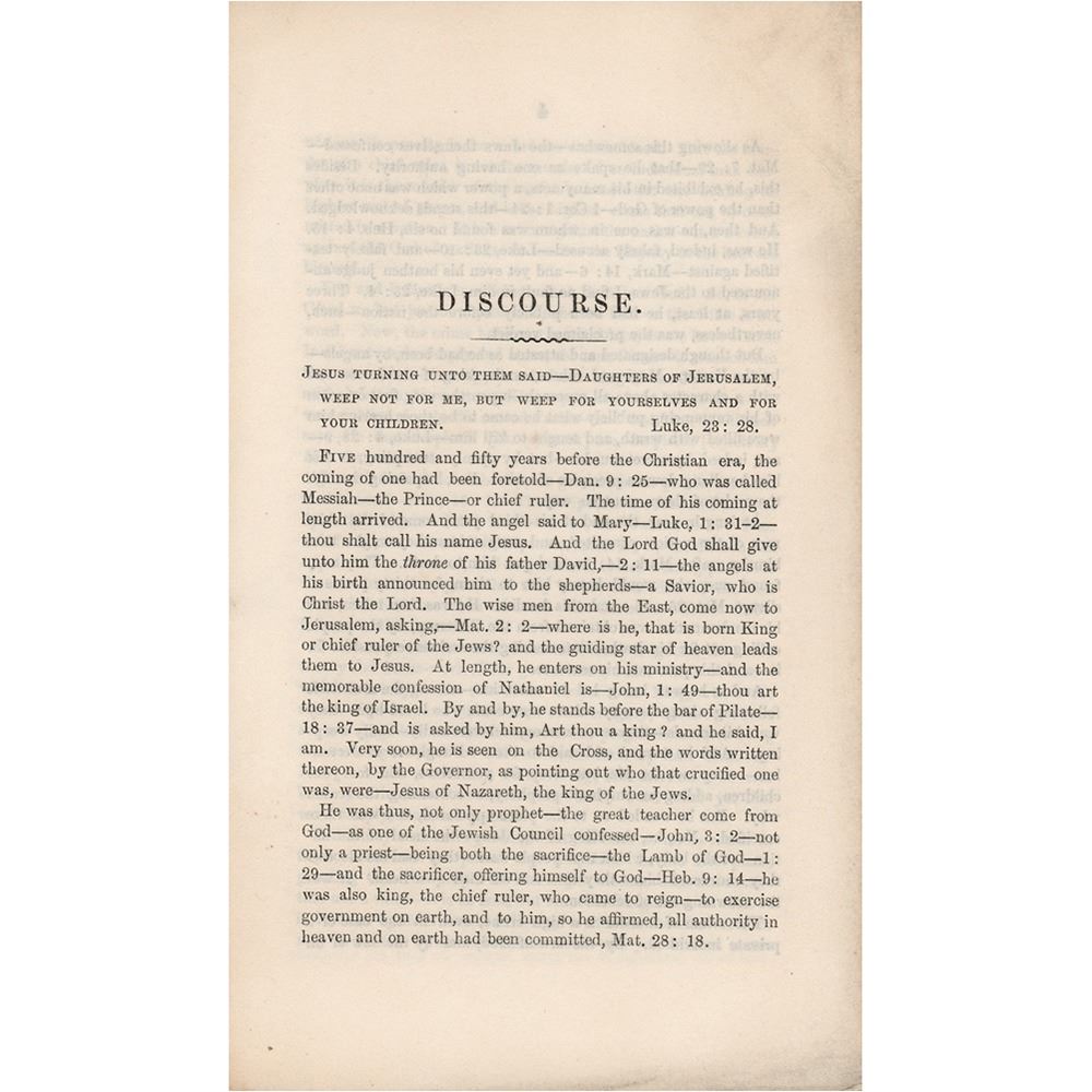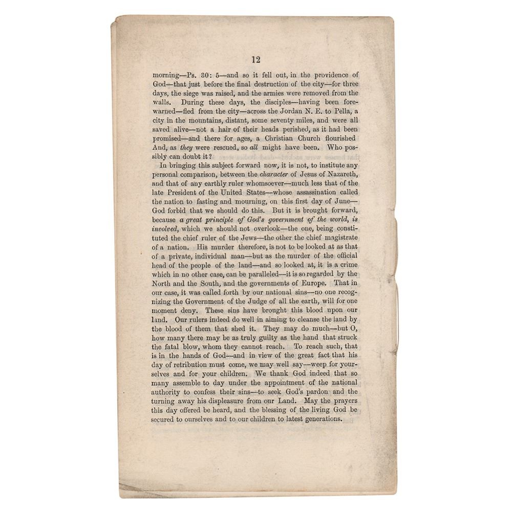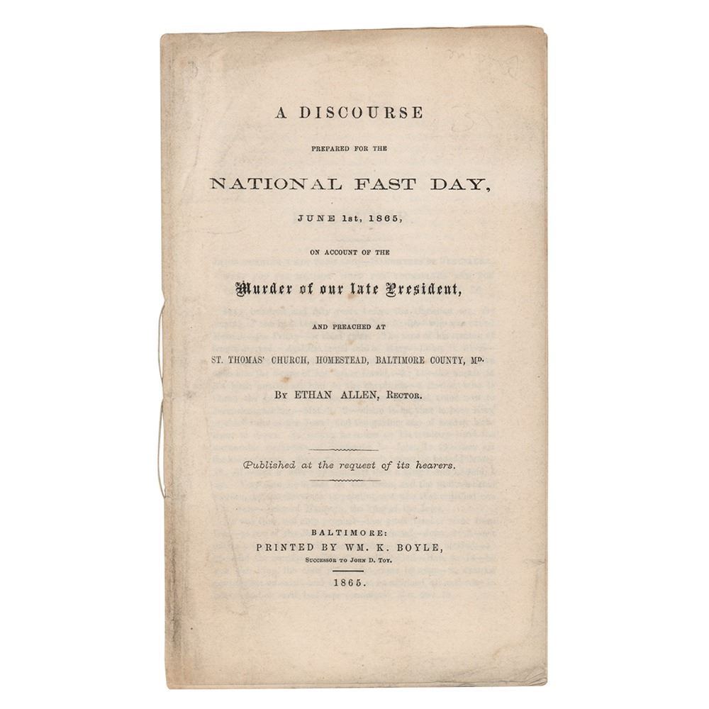Booklet entitled "A Discourse prepared for the National Fast Day, June 1st, 1865, on account of the Murder of our late President, and preached at St. Thomas' Church, Homestead, Baltimore County, Md., by Ethan Allen, Record," twelve pages, 4.5 x 7.5, published in Baltimore in 1865 by Wm. K. Boyle. Rev. Allen's discourse is filled with biblical references and allusions, and concludes, in part: "In bringing this subject forward now, it is not, to institute any personal comparison, between the character of Jesus of Nazareth, and that of any earthly ruler whomsoever—much less that of the late President of the United States—whose assassination called the nation to fasting and mourning, on this first day of June—God forbid that we should do this. But it is brought forward, because a great principle of God's government of the world, is involved, which we should not overlook—the one, being constituted the chief ruler of the Jews—the other the chief magistrate of a nation. His murder therefore, is not to be looked at as that of a private, individual man—but as the murder of an official head of the people of the land—and so looked at, it is a crime which in no other case, can be paralleled—it is so regarded by the North and the South, and the governments of Europe. That in our case, it was called forth by our national sins—no one recognizing the Government of the Judge of all the earth, will for one moment deny. These sins have brought this blood upon our land." Simply bound with string and missing its wrappers. In fine condition.