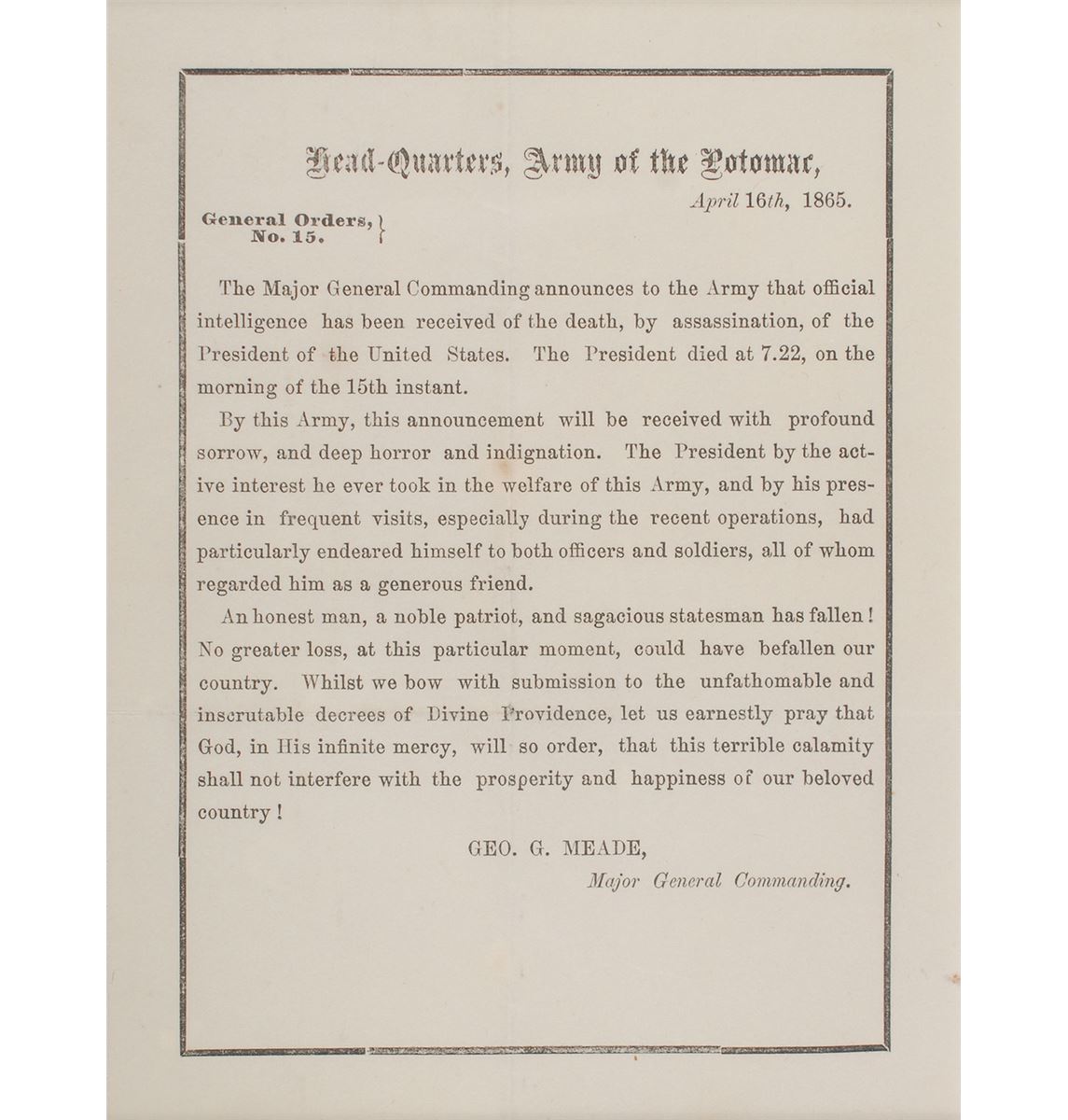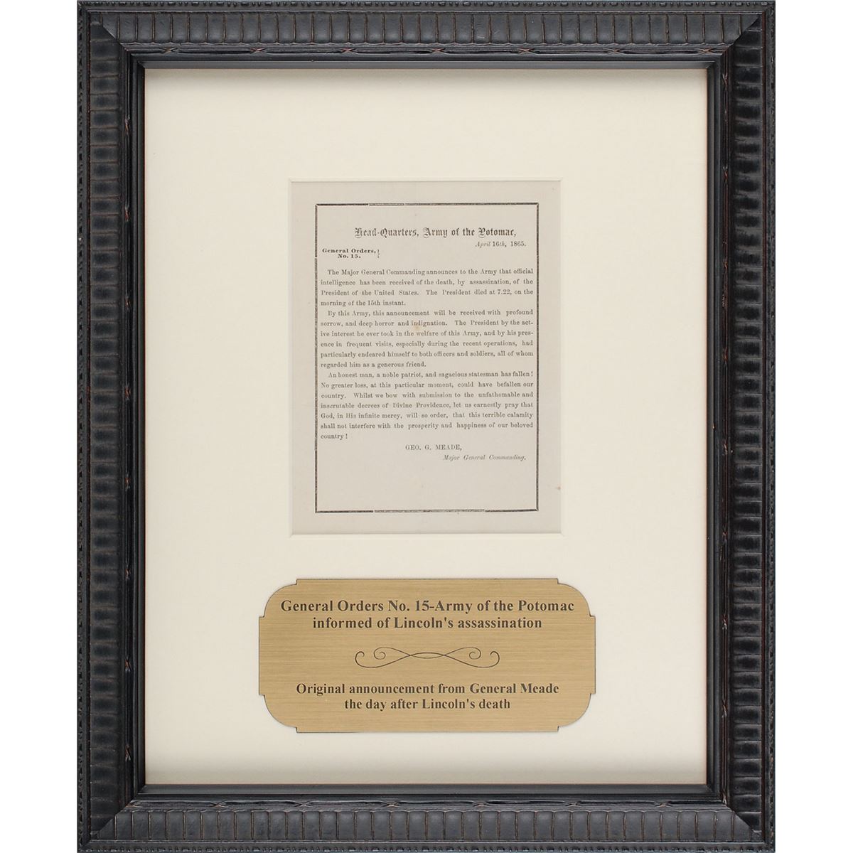 Black-bordered printed general orders, one page, 4.25 x 5.75, April 16, 1865. General Orders No. 15 issued by General George G. Meade to inform the Army of the Potomac of President Lincoln’s death. In part: “Official intelligence has been received of the death, by assassination, of the President of the United States…By this Army, this announcement will be received with profound sorrow, and deep horror and indignation…An honest man, a noble patriot, and sagacious statesman has fallen! No greater loss, at this particular moment, could have befallen our country.” Handsomely matted and framed with a descriptive plaque to an overall size of 11.5 x 14. In fine condition, with intersecting folds and trivial soiling.