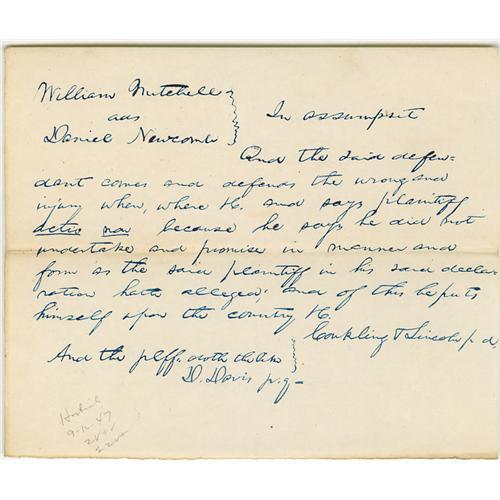<B>Abraham Lincoln. Autograph Document Signed "Conkling & Lincoln p.d.</B></I>" No place or date [Clinton Co., Ill., April 1846], one page, oblong large octavo. In William Mitchell vs Daniel Newcomb, the defendant declares "<I>he did not undertake and promise in manner and form as the…plaintiff…hath alleged…</B></I> " Lincoln has also written, at lower left, the response from the plaintiff's attorney, David Davis, and signed for him ("<I>And the plff. doth the like / D. Davis p.q."</B></I>). Lincoln was very close to Davis, who as a circuit court judge heard hundreds of his cases during the 1850's; on at least a few occasions Lincoln even sat in for Davis on the bench. In 1860 Davis adroitly managed to secure Lincoln the Republican Presidential nomination, and in turn was appointed by Lincoln an Associate Justice of the United States Supreme Court. From the Henry E. Luhrs Collection.