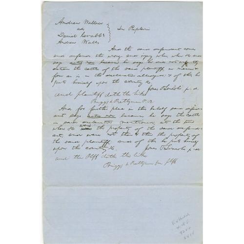 <B>Abraham Lincoln. Autograph Document Signed twice "Jones & Lincoln p.d."</B></I> No place or date [Tazewell Co., Ill.; docketed May 1853], two-thirds page, folio, on ruled blue paper. In Daniel Crabb and Andrew Watts vs Andrew Wallace, the defendant asserts that he "<I>did not unjustly detain the cattle of the said plaintiffs, in manner & form as…alledged</B></I>" and that the cattle were at the time his own property and "<I>not then & there the property of the said plaintiffs…</B></I>" From the Henry E. Luhrs Collection.