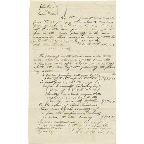 <B>Abraham Lincoln. Autograph Document Signed twice</B></I>"Wilmot & Lincoln p.d." No place, no date (Tazewell Co., Ill.; docketed April 1844). In Seaborn Moore vs John Davis, the defendant states that on trial he will <I>"prove and set off against the claim of the plaintiff"</B></I> two promissory notes, plus payment of two judgments against Moore on which Davis was security, and <I>"the value of three hundred trees"</B></I> furnished by Davis to Moore, totaling in all about $689. Lincoln writes that the promissory notes are being filed <I>"and set up in defence in the case. And the defendant claims a judgment over against the plaintiff."</B></I> Lincoln's colleague in this suit, William H. Wilmot, died the following year and Lincoln chaired the committee which, on behalf of members of the bar in adjoining counties, drew up sympathy resolutions. From the Henry E. Luhrs Collection.