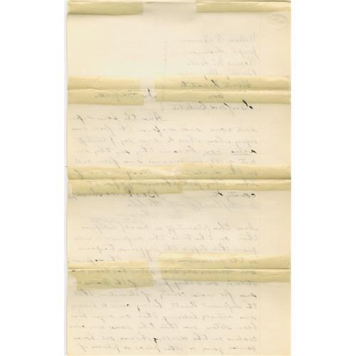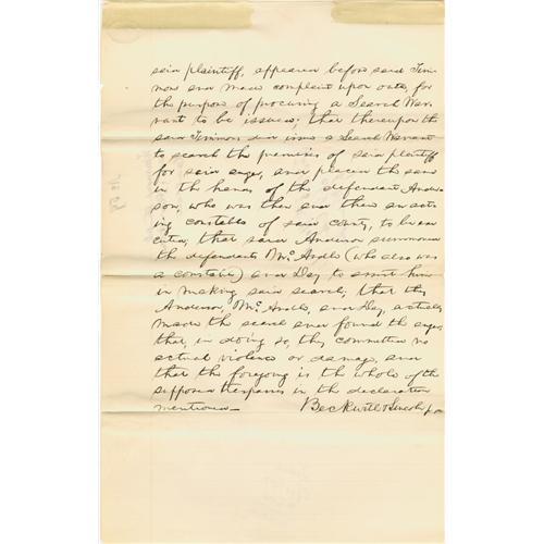 <B>Abraham Lincoln. Autograph Document Signed twice</B></I> "Beckwith & Lincoln p.d." No place or date [Vermilion Co., Ill.; docketed May 1859], two pages, folio. In Sanford Calvert vs Wm. R. Timmons, Joseph Anderson, Remus McArdle, Barney Day and Albert Heath, the defendants offer to prove upon trial that Timmons was a justice of the peace and that Heath, "<I>believing that an auger had been stolen, and…was concealed in the dwelling house, out-house, garden, yard or other place or places of…plaintiff</B></I>" made a complaint before Timmons, who issued a search warrant that was "<I>placed…in the hands of…Anderson, who was…an acting constable…Anderson summoned…McArdle (who also was a constable) and Day to assist him in making said search…and found the auger…[I]n doing so, they committed no actual violence or damage…[T]he foregoing is the whole of the supposed trespass in the declaration mentioned.</B></I>" Glassine repairs/strengthening on verso of each leaf to weak or slightly broken folds. From the Henry E. Luhrs Collection.