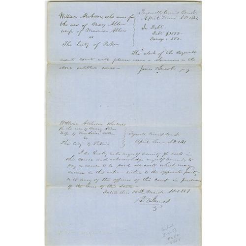 <B>Abraham Lincoln. Autograph Document Signed</B></I> "James & Lincoln p.q." Tazewell Co. (Ill.), April 1851, one-quarter page, folio. The circuit court clerk is requested to <I>"please issue a summons"</B></I> in the case of William Atchison (suing for Mary, wife of Madison Allen) vs the City of Pekin. At foot, attorney B.F. James has written an Autograph Document Signed entering himself as security for costs in the case. Benjamin F. James was one of the few candidates whom Lincoln personally examined for admission to the bar. James entered practice in 1841 and was frequently involved in cases with Lincoln during the following decade. From the Henry E. Luhrs Collection.