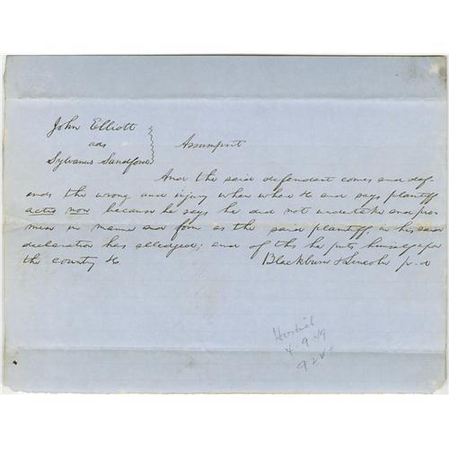 <B>Abraham Lincoln. Autograph Document Signed</B></I> "Blackburn & Lincoln p.d." No place [Edgar Co., Ill.], May 12, 1851, about one-half page, oblong octavo. In Sylvanus Sandford vs John Elliott, the defendant states <I>"he did not undertake and promise in manner and form as the…plaintiff in his…declaration has alledged…"</B></I> Overleaf, Lincoln has written the filing docket <I>"Elliott ads Sandford / Plea"</B></I> as well as the notation <I>"Filed May 12, 1851",</B></I> beneath which the court clerk has signed. Tiny loss at one corner in blank area. From the Henry E. Luhrs Collection.